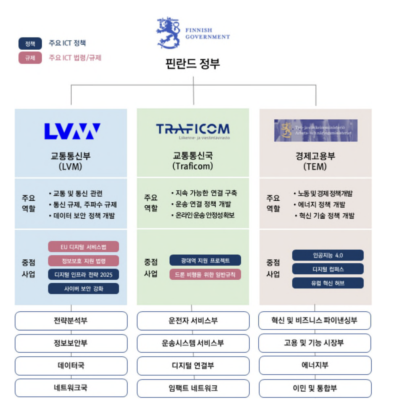 경제 및 고용부 (Ministry of Economic Affairs and Employment) : 디지털 경제의 발전을 촉진하고, 디지털 기술과 관련된 산업 정책을 수립한다. 이 부서는 디지털화가 고용과 경제 성장에 미치는 영향을 고려하여 관련 정책을 개발한다