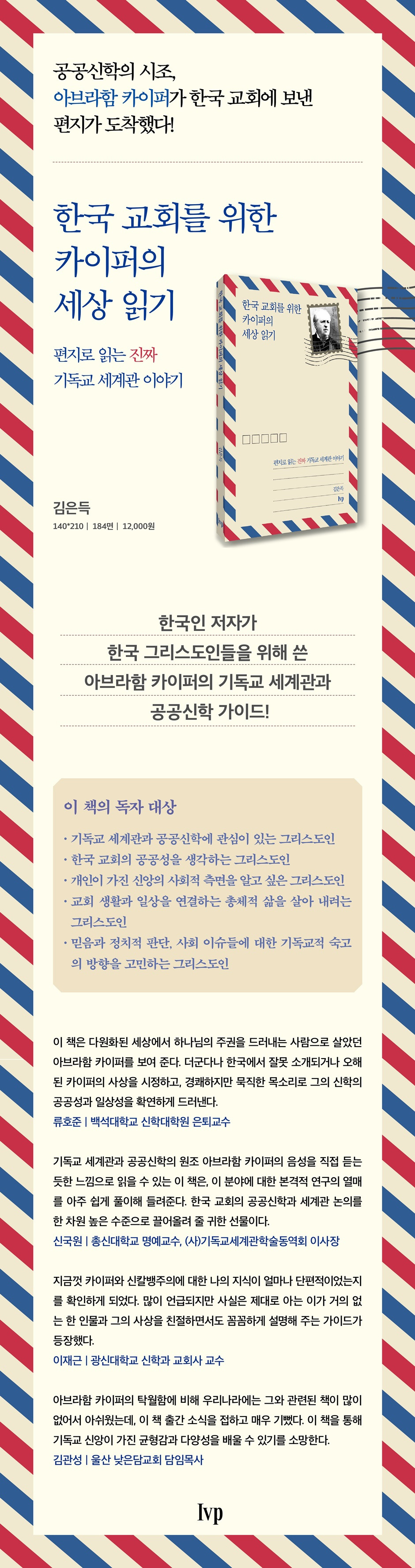 한국인 저자가 한국 그리스도인들을 위해 쓴 아브라함 카이퍼의 기독교 세계관과 공공신학 가이드다. 아브라함 카이퍼가 말한 기독교 세계관을 본래의 맥락에서 살펴보면, 그가 기독교 신앙과 현실의 삶 사이를 연결하는 문제와 교회의 공적 효용에 대해 치열하게 고민했고 이를 바탕으로 사회를 변화시켰음을 알 수 있다. 아브라함 카이퍼의 사상을 일인칭 시점의 편지 형식으로 풀어 쓴 이 책은 한국의 그리스도인들이 이미 가지고 있는 유산을 새롭게 인식하게 한다. 또한 기독교 세계관과 공공신학의 논의들이 단지 이론에 그치지 않고, 교회를 변화시키고 더 나아가 사회를 예수 그리스도의 복음이 제시하는 원리에 따라 형성해 나갈 수 있다는 희망을 발견하게 한다.