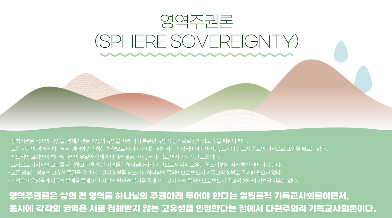 위에서도 언급했지만 카이퍼의 기독교 세계관은 몇가지의 특징이 있다. 바로 영역주권론이다. 모든 영역에서 하나님의 주권을 인정하게 되면 모든 것이 하나님과 연결되었다고 단순하게 치부할 수 있지만, 영역마다 하나님이 운영하는 원리가 다르다고 한다면 하나님과 연결된 모습이 달라질 것이다. 더욱이 한 영역에서는 분화와 개화가 일어나면서 계속해서 만들어지고 세분화되는 가운데 영역들의 완전성이 이루어진다. 이러한 영역들은 서로 독립되어 있지만 상호존중하는 상태이며 이를 통해서 하나님은 영역마다 독특한 구조와 방향으로 인간의 문화를 이끌고 계신다.