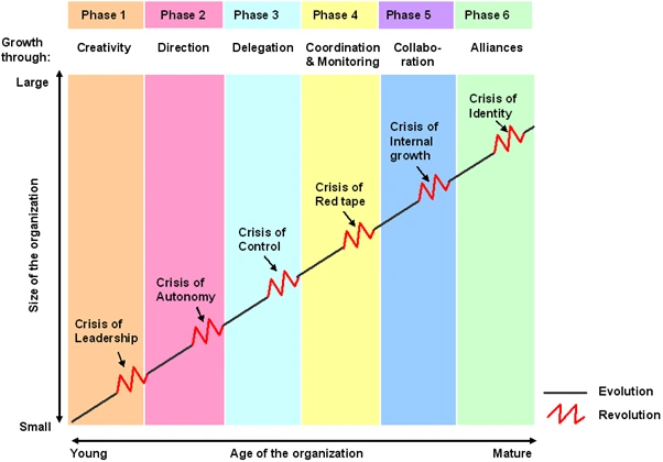 위기: 리더십 위기(Leadership Crisis) - 조직이 성장하면서 관리와 조정의 필요성이 증가했다. 초기 창업자의 비공식적 리더십이 한계에 도달하여, 더 구조적이고 체계적인 관리 방식이 필요해졌다. 이 시점에서 전문 경영자를 채용하거나, 창업자가 리더십 스타일을 변화시키지 않으면 혼란이 발생할 수 있었다. 예를 들어, 스타트업이 성공적으로 성장한 후, 창업자의 리더십 스타일이 조직의 성장을 저해하게 되는 경우가 있었다.