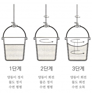 뉴턴의 양동이 사고실험은 줄을 매달은 양동이를 회전시킴으로써 처음에는 양동이 벽에 물이 차오르다가 결국 계속된 회전으로 양동이 안의 물이 오목한 형태로 귀착되는 것을 말한다. 이를 통해서 뉴턴은 절대운동을 관찰할 수 있다고 보았고 이는 물체가 단지 하나의 참된 원운동을 가진다고 주장했다. 뉴턴의 기본적인 생각은 상대운동은 물체에 부과되는 힘 없이 일어나는 운동인 반면 절대운동은 힘에 의해 야기되는 운동이라는 것이다. 이러한 관점에 대해서 마흐, 버클리, 라이프니츠와 같은 사람들은 반대했다. 뉴턴에게 공간은 실재적 물체의 용기이고 물질 없이도 존재할 수 있는 것이었다. 공간을 물질을 나누는 수단으로 가능한 것이었다. 그러나 라이프니츠에게 공간은 물질적 대상의 위치적 성질이고 물질 없니는 상상할 수도 없는 것이었다.