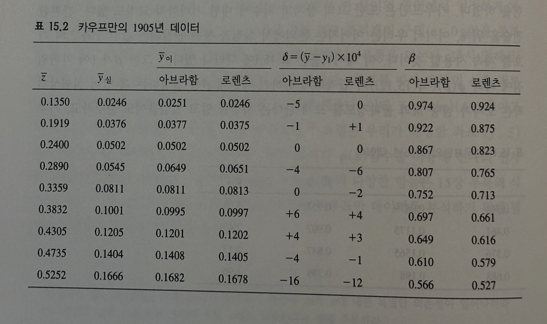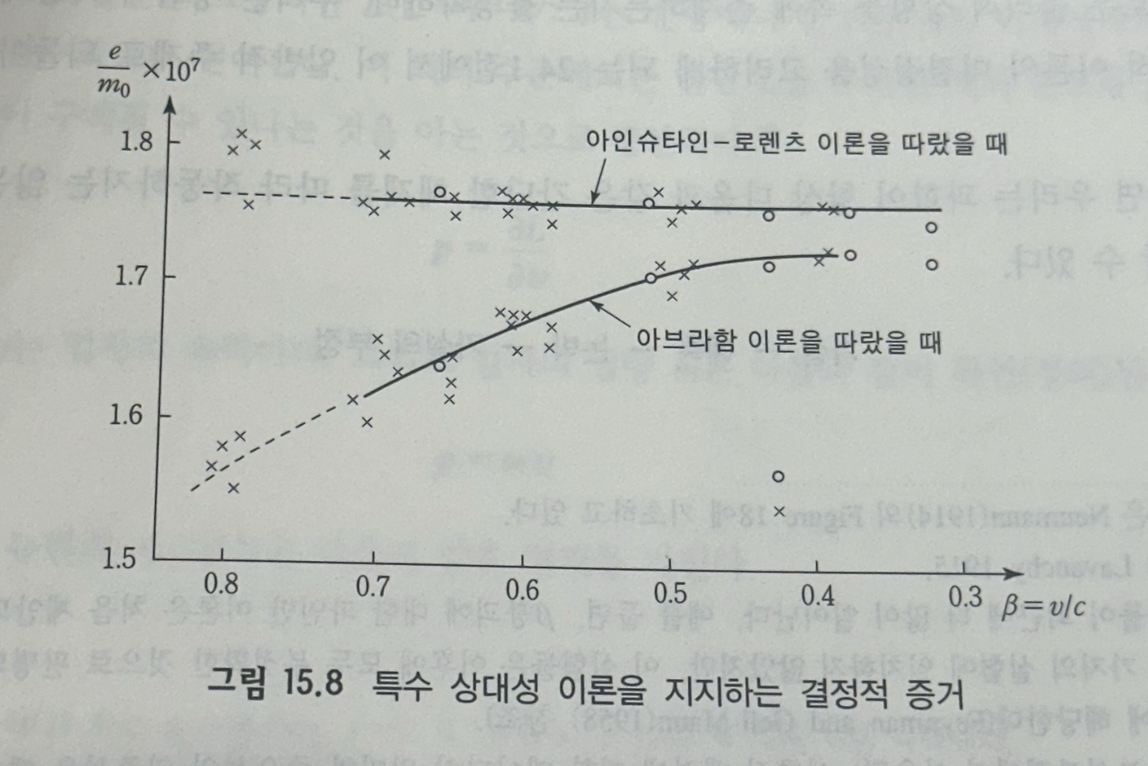 표 15.6은 e/m0 값이 아브라함의 이론보다 로렌츠의 이론에서 더 일정한 값을 가짐을 보인다. 1914년 어떤 이론이 가장 정확하게 일정한 e/m0 값을 도출하는지의 문제가 분명하게 해결되었다. 부커러 방법을 수정하여 26개 데이터 점 을 얻을 수 있었다. 아브라함의 이론을 뛰어넘는 로렌츠 이론의 탁월함은 그림 15.8에서 분명히 드러난다. 이 결과들은 1915년에 다시 독립적으로 확인되었다.