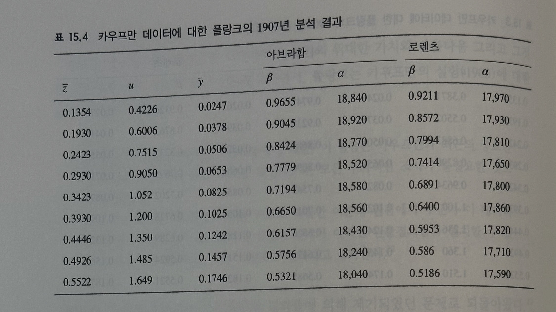 플랑크분석의 중요한 성과는 카우프만의 실험이 더 이상 상대성 이론의 수용을 망설이게 하는 걸 림돌이 되지 않는다는 것이었다. 1907년 상대성에 대한 리뷰논문에서 아인슈타인은 카우프만의 데이터를 이용하여 에 대한 J의 그래프(그림 15.7)를 제안했고 이것을 상대성 이론에 비교하였다. 이 그래프에 서 점들은 카우프만의 데이터 9개를 나타낸다. 연결된 곡선은 이 점들을 잇는 선분 조각 들의 조합으로 나타난다.