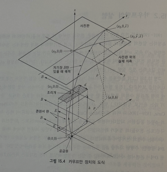 그림 15.3의 그의 출판물들 중 하나에 기초한 도식은 카우프만 실험 장치의 기본적인 디자인을 보여준다. 진공 챔버 안에 놓여 있는외부의 원통 용기에는 석영 절연체에 의해 분리된 수직의 콘덴서판 한 쌍이 (이 도체-절연체-도체의 배열은 때때로 '축전기' 라는 용어로 칭해진다.) 있다.