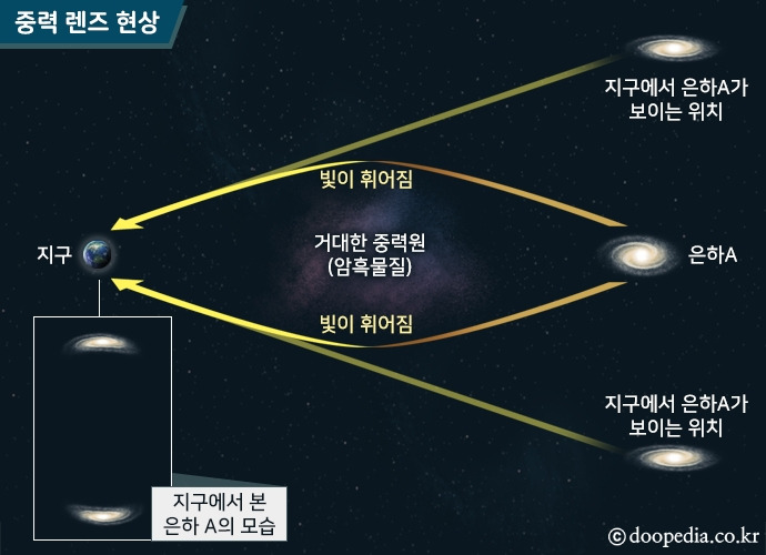 시공간의 왜곡 : 질량이 큰 천체(예: 별, 블랙홀, 은하)는 시공간을 휘게 만듭니다. 빛은 직선으로 움직이려고 하지만, 시공간이 휘어져 있으면 휘어진 경로를 따라가게 됩니다.