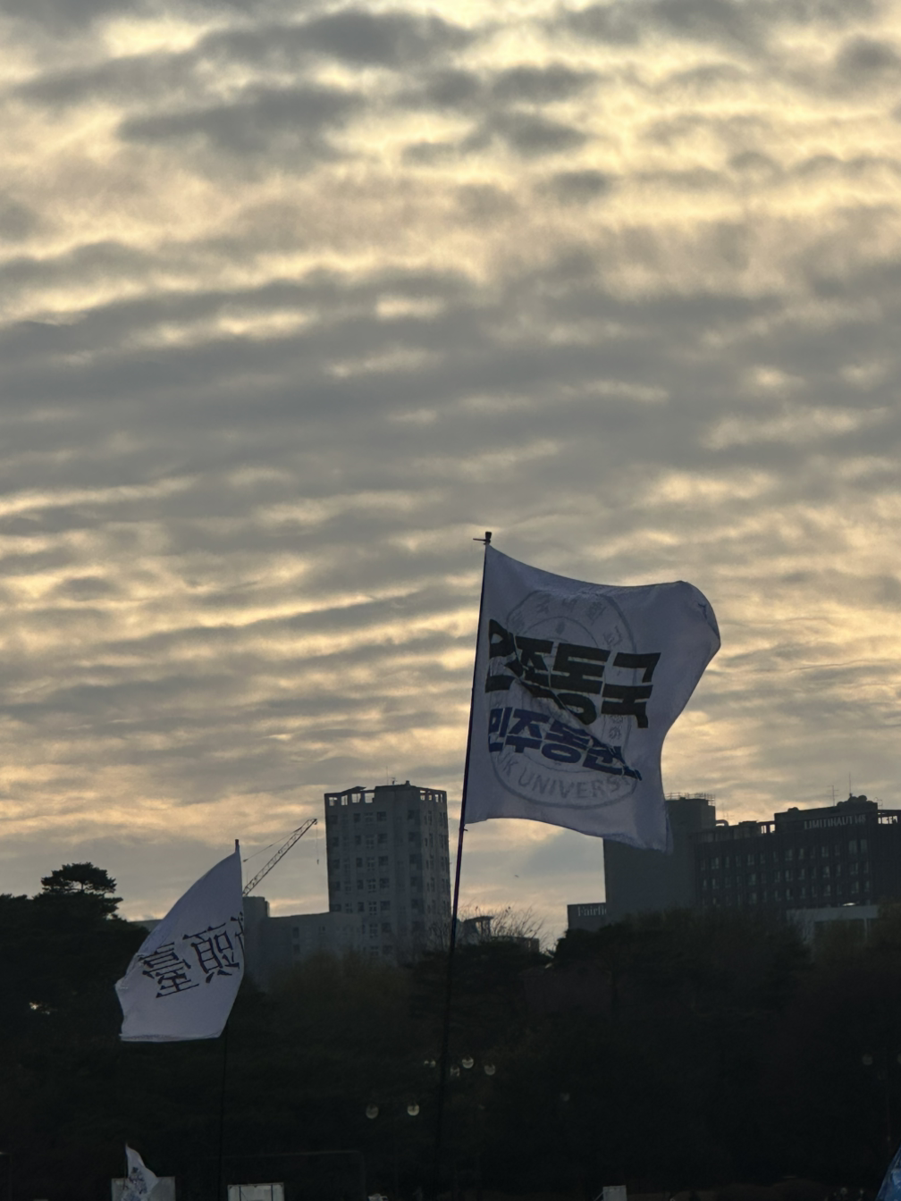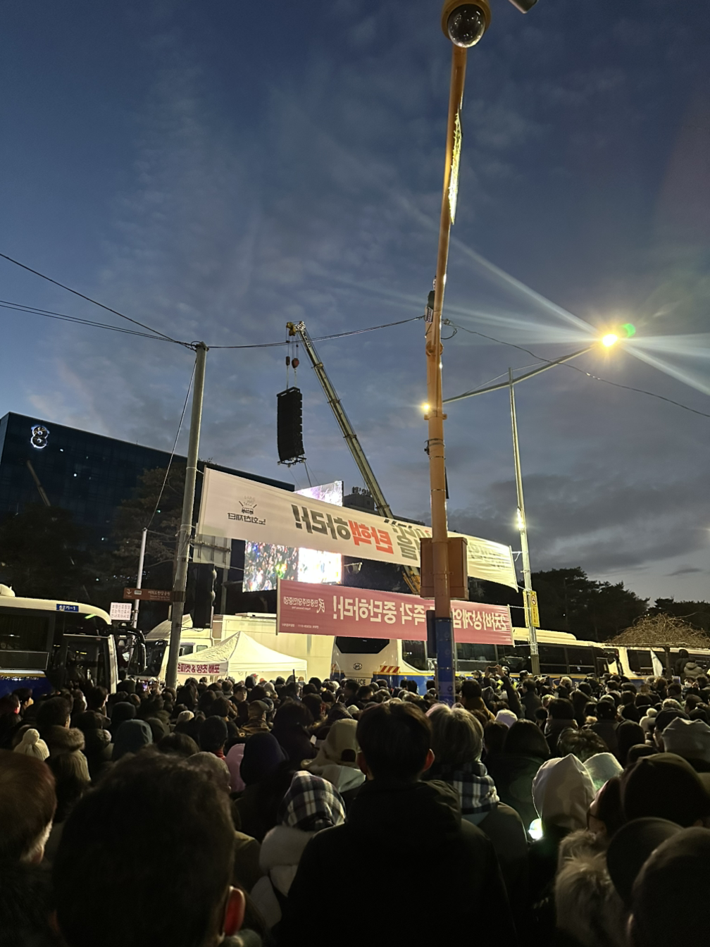 들어가기에는 늦어서 밖에서 외치는 무리에서 있었다. 조금 있으니 당원들을 만나고 아는 분들과 함께 상황을 지켜보았다. 여차 하면 국회 안으로 들어가서 인간방패라도 되어야겠다는 생각이 들었다. 연기가 피어오르고 공수부대가 국회를 점거하려는 움직임이 보였다. 차마 경찰의 벽을 뚫고 안으로 들어갈 용기가 없어서 밖에서 시위대와 함께 움직이면서 내란죄를 일으킨 이의 타도를 외쳤다. 경찰들은 갈팡질팡했고, 공수부대는 우왕좌왕했으며, 국회의원들은 다행히 190명이나 본회의장으로 들어가서 비상계엄을 해제하는 투표를 했다. 그 순간까지 얼마나 가슴이 조마조마하고 무슨 일이 일어날 것 같은 두려움에 휩싸였는지 모른다. 광주사태가 떠오르고 사람들이 끌려가던 이미지들이 둥둥 떠다녔다. 안에서 본회의장을 지키는 사람들이 안스러우면서도 당장 내 목숨을 내 놓아야 한다는 건 여간 쉬운게 아니었다. 그렇게 광주가 생각나는 밤. 결국 비상계엄이 해제되었고 사람들은 한 숨을 놓았다. 집에와서 선잠이 들었다.