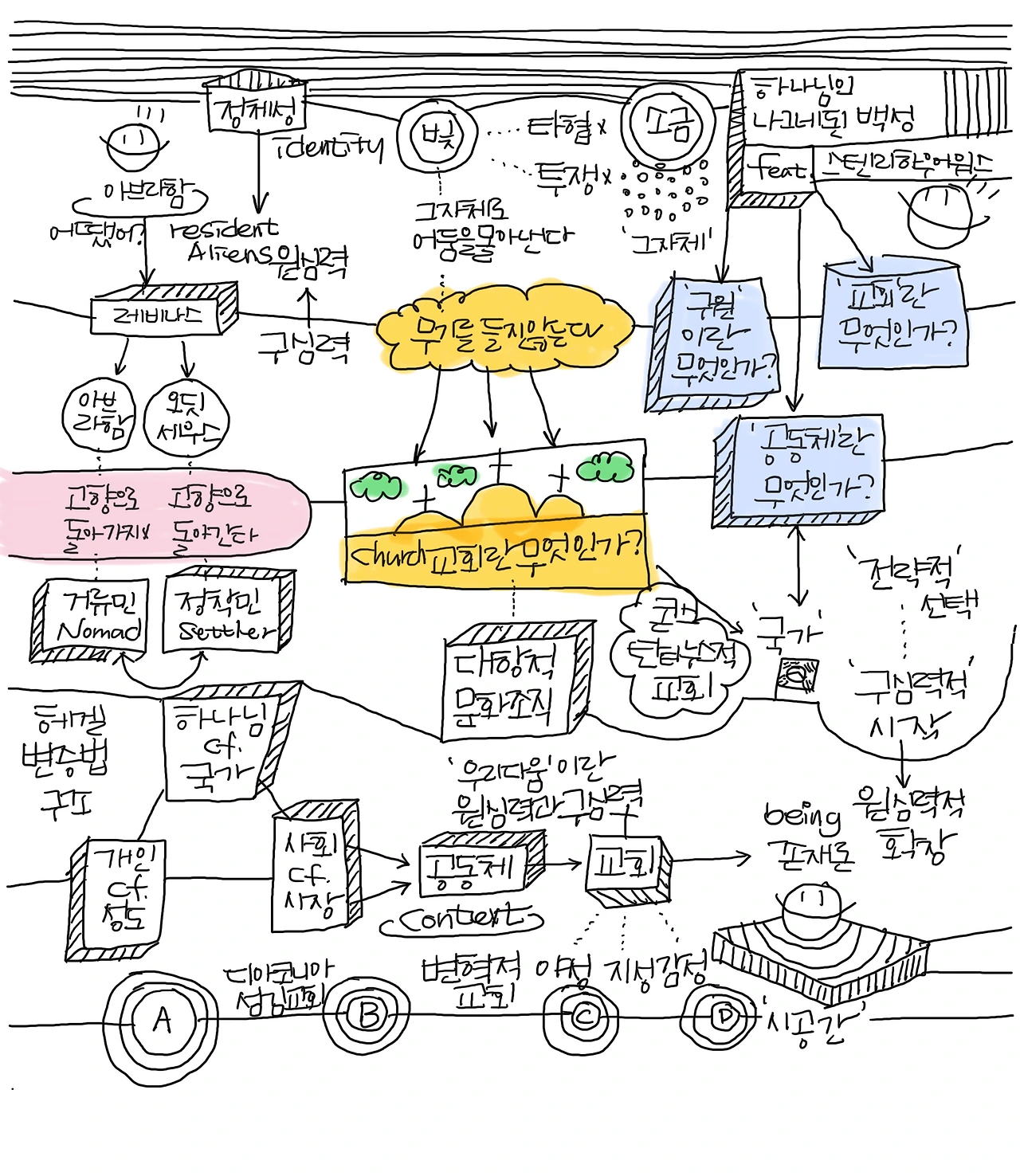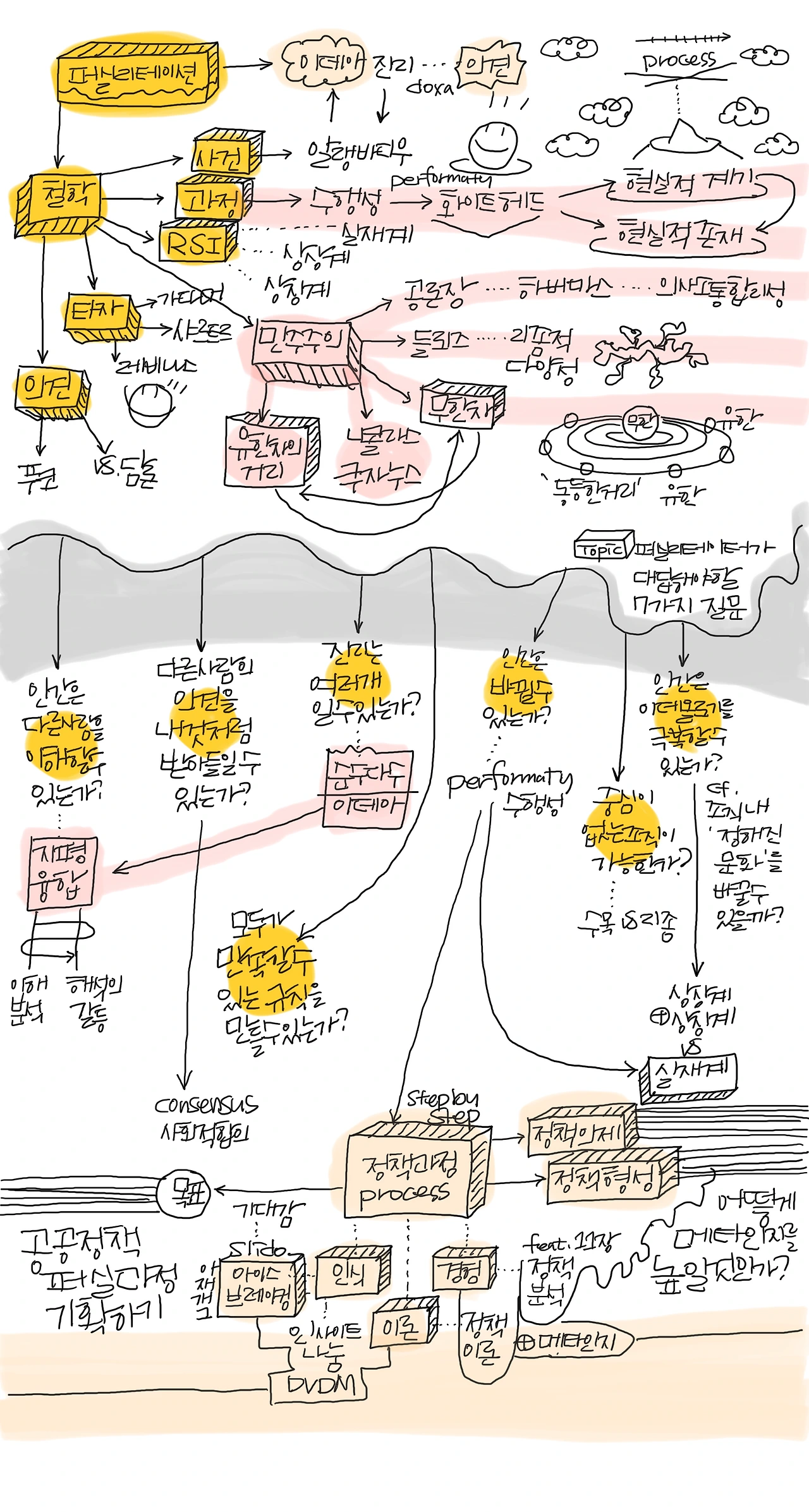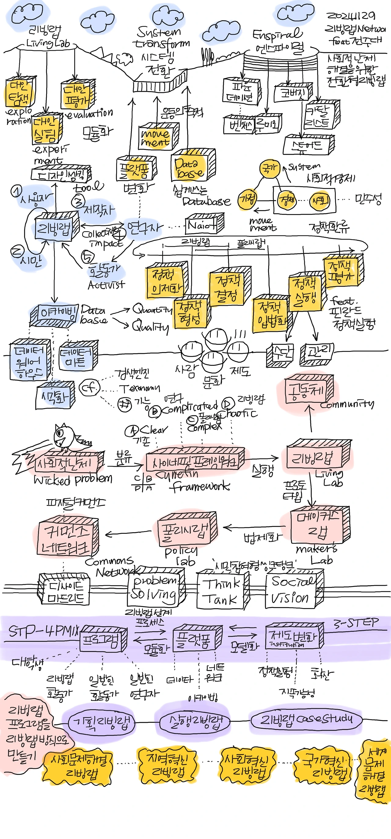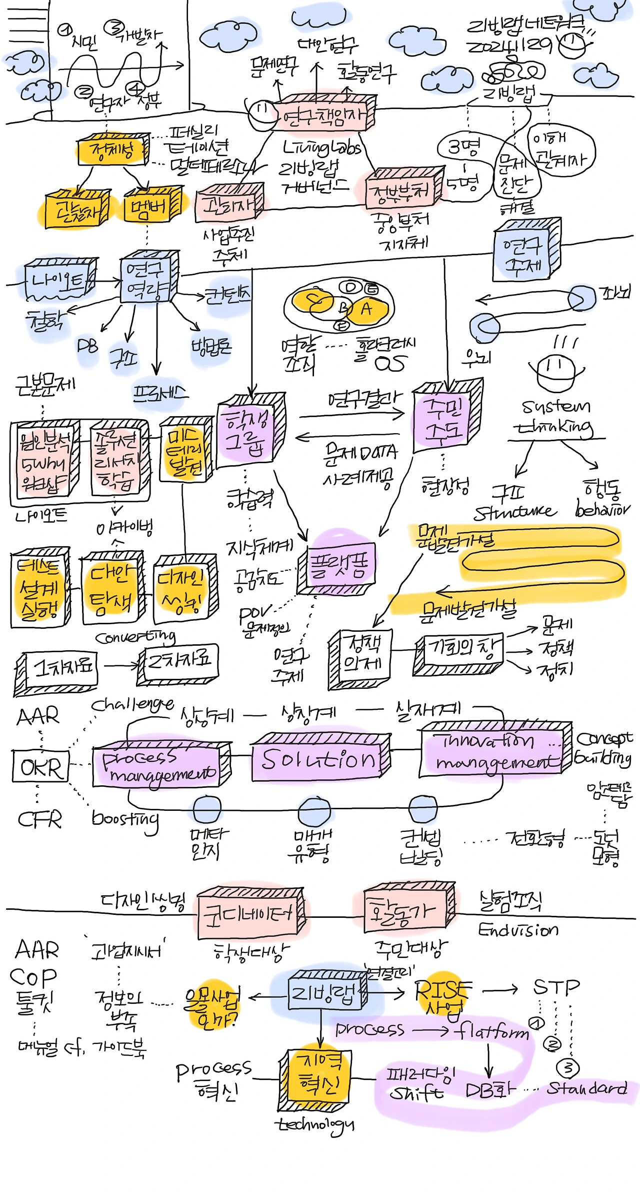 작년에 이어서 올해 초까지 새롭게 시작한 일들이 많았다. 그럴 때면 언제나 먼저 생각을 몇십번씩 그 주제에 대해서 해보고 머릿속에 무엇인가 잡히면 펜을 들고 그림을 그렸다. 그림이기 보다는 메모를 하고 인과관계를 맞혀보았다. 이번년도 초에는 정책퍼실리테이션을 기획했었고, 함께걷는 교회에서 들은 설교를 정리하기도 하고, 작년말에 리빙랩 커뮤니티에서 들은 내용을 바탕으로 새로운 그림을 그려보기도 했다. 머릿속에 상상으로 떠오른 것들을 상징계인 '기호'로 꺼내서 이해할 수 있는 도식을 만드는 작업들이 더욱 전문성을 가지면 좋겠다. 앞으로도 분발해야겠다. 이제 대학원 공부도 끝났으니 무수한 도식이 한번으로 겹치는 그림을 그려야 할 때가 되기도 했다.