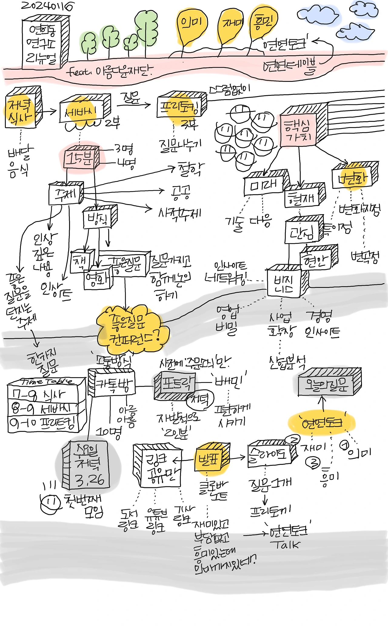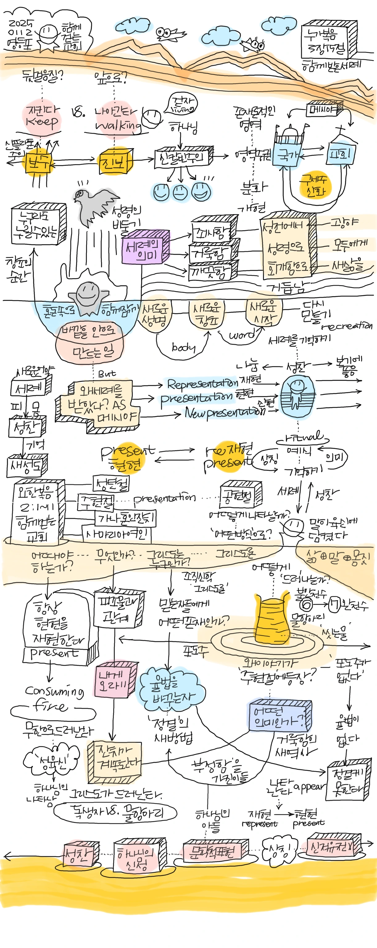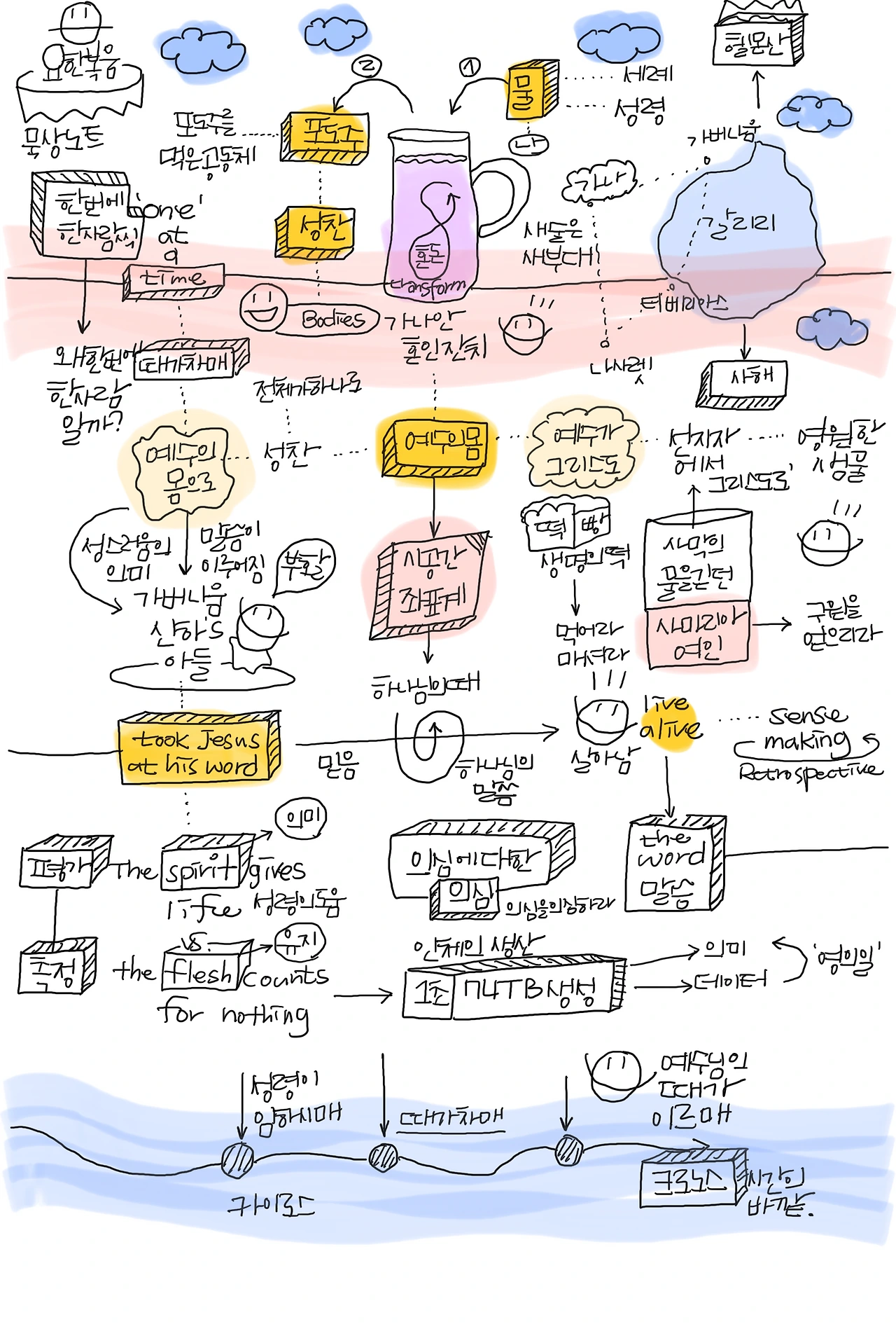 작년에 이어서 올해 초까지 새롭게 시작한 일들이 많았다. 그럴 때면 언제나 먼저 생각을 몇십번씩 그 주제에 대해서 해보고 머릿속에 무엇인가 잡히면 펜을 들고 그림을 그렸다. 그림이기 보다는 메모를 하고 인과관계를 맞혀보았다. 이번년도 초에는 정책퍼실리테이션을 기획했었고, 함께걷는 교회에서 들은 설교를 정리하기도 하고, 작년말에 리빙랩 커뮤니티에서 들은 내용을 바탕으로 새로운 그림을 그려보기도 했다. 머릿속에 상상으로 떠오른 것들을 상징계인 '기호'로 꺼내서 이해할 수 있는 도식을 만드는 작업들이 더욱 전문성을 가지면 좋겠다. 앞으로도 분발해야겠다. 이제 대학원 공부도 끝났으니 무수한 도식이 한번으로 겹치는 그림을 그려야 할 때가 되기도 했다.