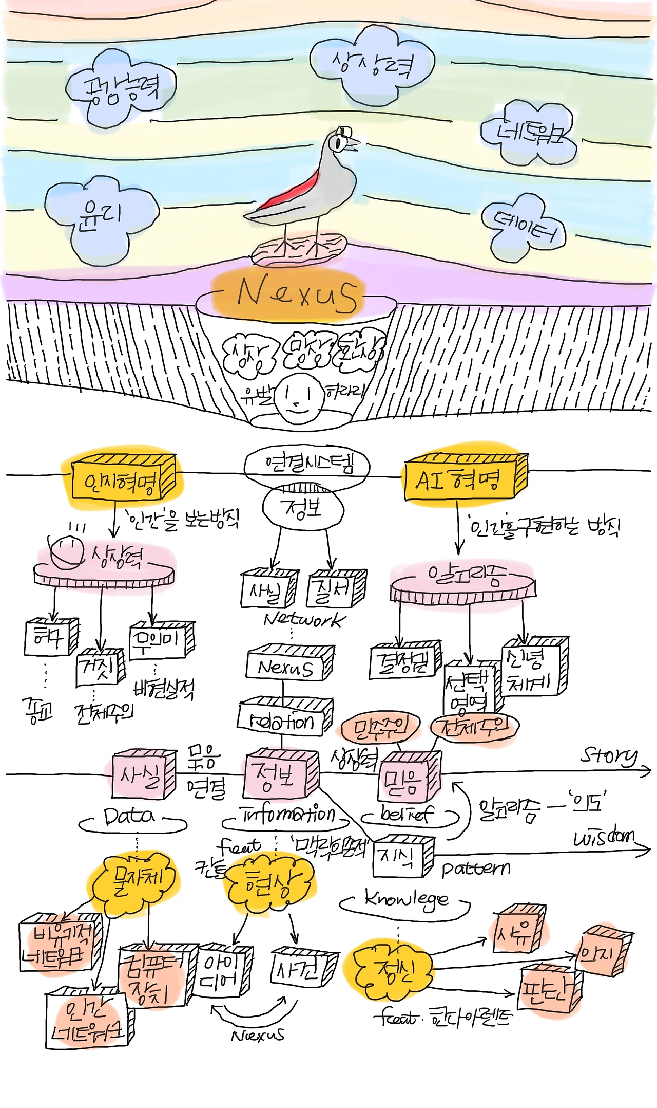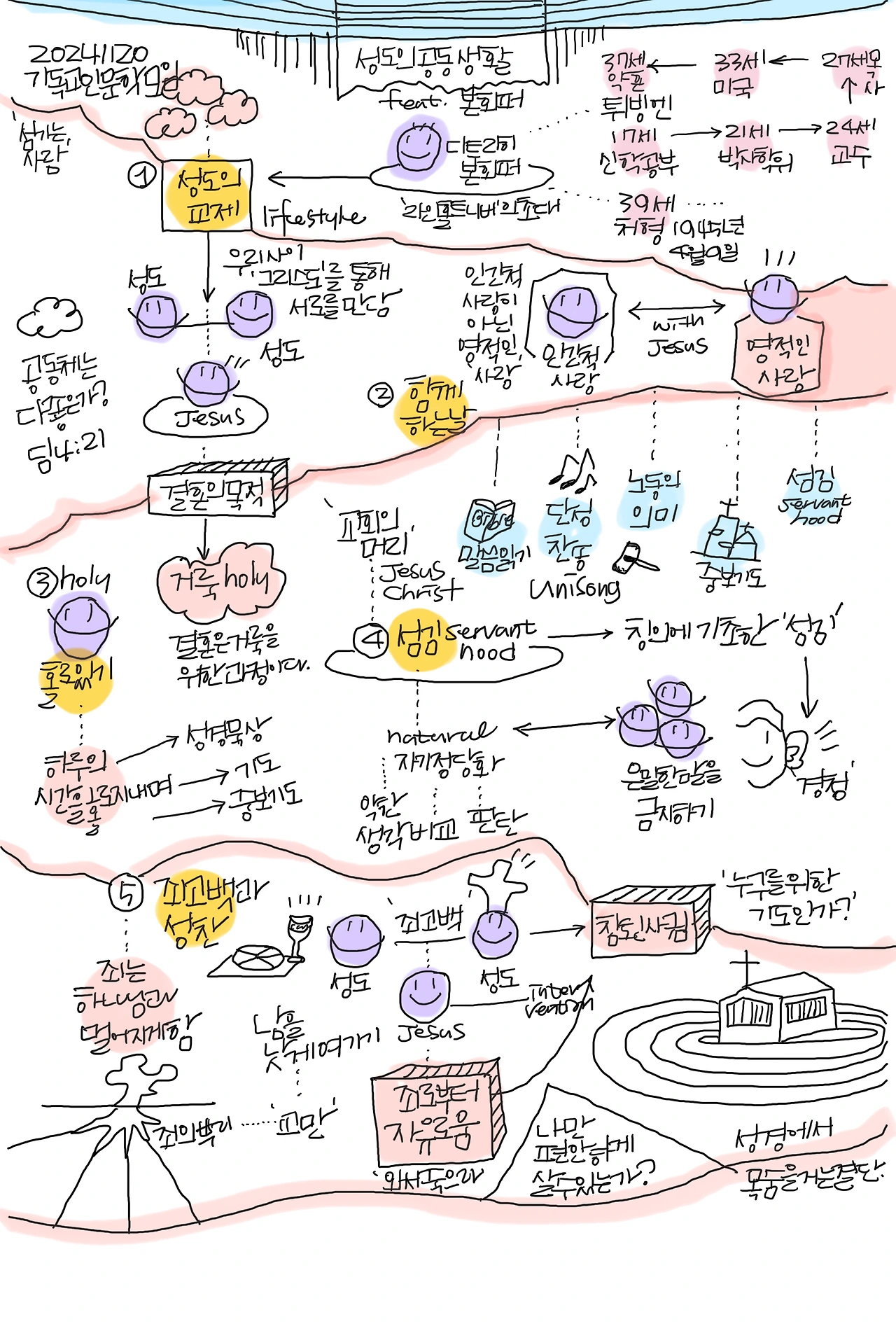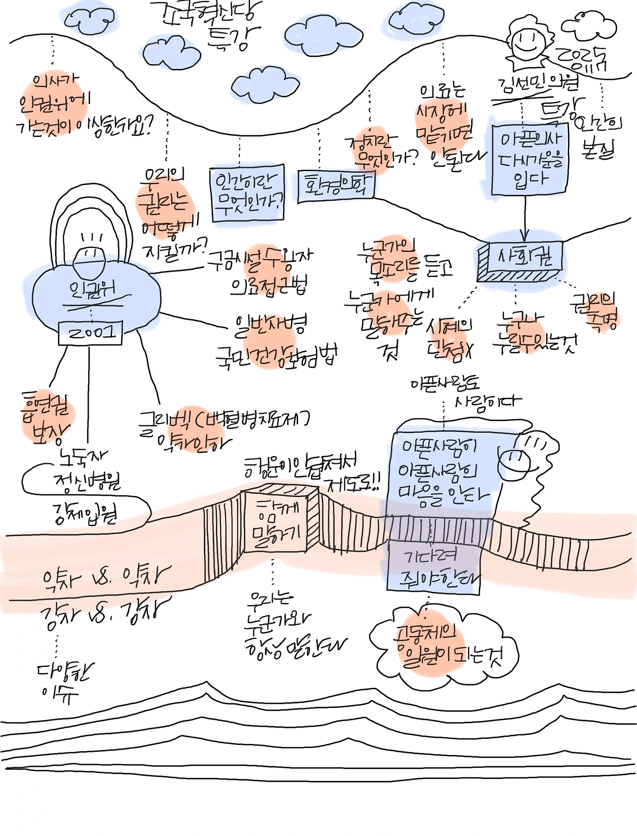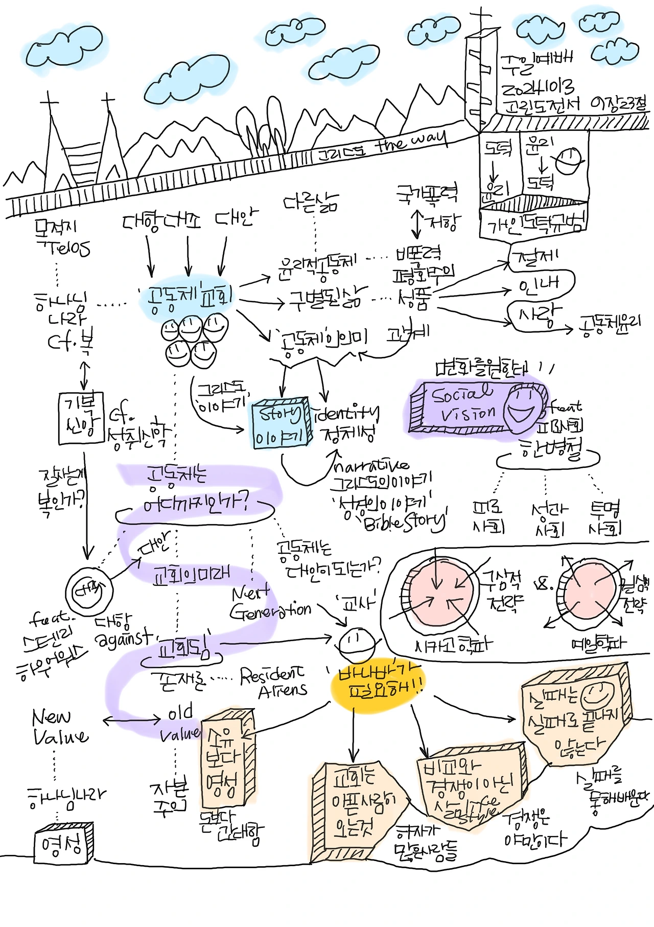 작년에 이어서 올해 초까지 새롭게 시작한 일들이 많았다. 그럴 때면 언제나 먼저 생각을 몇십번씩 그 주제에 대해서 해보고 머릿속에 무엇인가 잡히면 펜을 들고 그림을 그렸다. 그림이기 보다는 메모를 하고 인과관계를 맞혀보았다. 이번년도 초에는 정책퍼실리테이션을 기획했었고, 함께걷는 교회에서 들은 설교를 정리하기도 하고, 작년말에 리빙랩 커뮤니티에서 들은 내용을 바탕으로 새로운 그림을 그려보기도 했다. 머릿속에 상상으로 떠오른 것들을 상징계인 '기호'로 꺼내서 이해할 수 있는 도식을 만드는 작업들이 더욱 전문성을 가지면 좋겠다. 앞으로도 분발해야겠다. 이제 대학원 공부도 끝났으니 무수한 도식이 한번으로 겹치는 그림을 그려야 할 때가 되기도 했다.