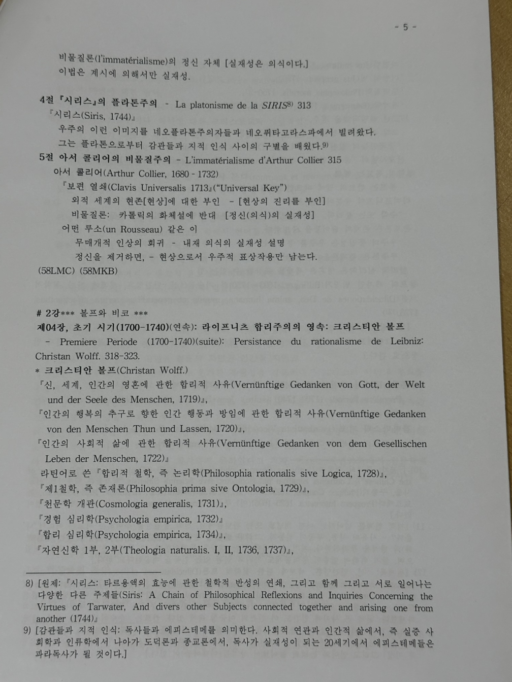 18세기는 '빛들의 세기'라고 부른다. 그리고 자연에 대해서, 영혼에 대해서, 의식의 인식에 대해서 형이상학적 체계를 벗어나는 실재적이고 경험적인 탐생이 핵심이었던 시대이다. 18세기는 대학 제도 속에서 철학보다, 제도 바깥에서 많은 논쟁이 일어났다고 볼 수 있다. 여기서 우리가 주목해야 하는 것은 뉴턴과 존로크이다. 이들이 정리한 '빛의 세기'는 이전까지 '하늘과 땅'의 구분값들을 뒤집어 버린다. 뉴턴은 '물리학'의 관점에서 운동들이 가진 원리들을 '법칙'으로 해석한다. 만유인력의 법칙과 같은 것들이 그것이다. 여기에 등장하는 철학자들은 뉴턴이 열어 놓은 세기를 따라간다. 말브랑쉬, 라이프니츠, 스피노자와 같은 철학자들은 거대한 신학적 체계들을 땅의 방식인 '법칙'으로 해석하려고 했다.