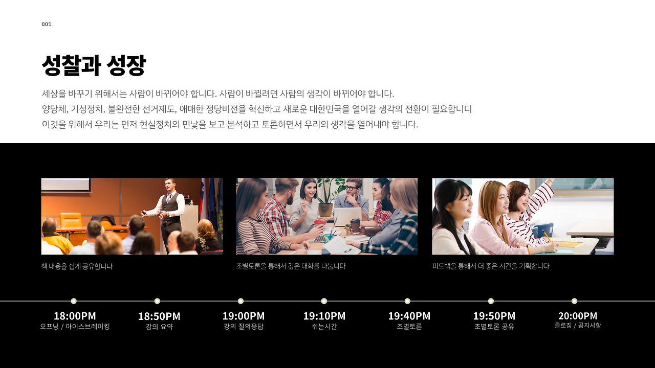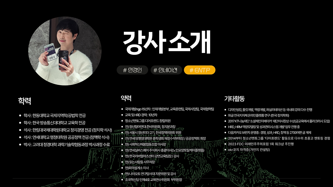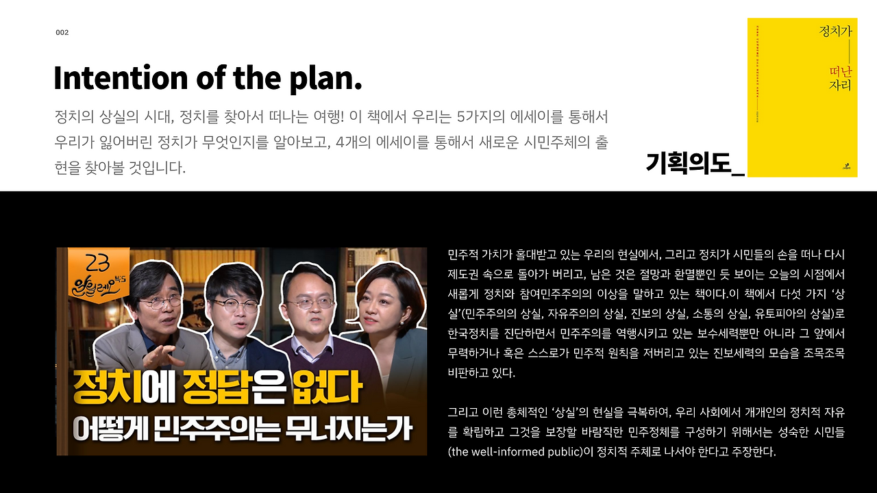 시민들과 정치적인 토론의 자리를 갖고자 무료 강연을 했다. 앞으로 2번 더 남았지만 나름대로 배워서 남주자라는 의미에서 좋은 시간이 되는 것 같다. 나한테는 당연한 지식인데 다른 사람들에게는 생소한 경우가 많았다. 나 혼자만의 세상에 빠져있지 않기 우해서 시민들과 주기적으로 만나야겠다는 생각도 했다. 이번 책은 '정치가 떠난 자리'라는 책이다. 존경하는 김만권 교수님이 10년전에 쓰신 책이지만 아직도 유효한 지식이라서 함께 에세이를 2개씩 읽어오고 토론을 하기로 했다. '성찰과 성장'이라는 단체에서 운영하는데 많지는 않지만 정치에 대해서 관심이 있으신 분들이 오셔서 서로 오붓하게 토론을 하고 논의를 했다. 앞으로도 이런 시간을 많이 가져야겠다. 중간에 이사장으로 활동하고 있는 해봄사업들도 소개하고 있다. (혹시나 누구라도 필요하면 연락을 주시면 무료로 강연도 가능합니다^^)