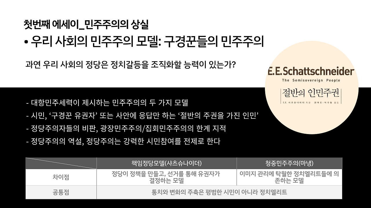샤츠슈나이더의 ‘책임정당모델’은 우리나라 진보진영에서 정당정치를 중심으로 하는 제도주의를 지지하는 정치세력들이 이론적으로 의지하고 정치적으로 지향하는 모델로서, 유권자들의 정당에 대한 충성을 전제로 정당이 유권자들의 입장을 대변해 활동해야 한다는 것이 골자다. 한편 마냉의 ‘청중민주주의’ 모델은 미디어를 통한 의사소통과 이미지 관리에 능한 정치엘리트들의 개개인의 능력에 의존하는 통치로, 2012년 한국정치를 뒤흔들었던 ‘안철수 현상’을 그 대표적인 사례로 꼽을 수 있을 것이다. 지은이는 한국의 진보적 정당주의자들이 이 두 모델 사이를 오가고 있다고 비판하면서, 이렇게 대항세력이 이끄는 민주주의 모델이 엘리트주의에 서 있는 현실, 참여의 욕망을 드러내는 시민들을 향해 직접적인 참여가 좋은 결과를 내지 못한다고 에둘러 변명하는 현실이 ‘민주주의의 상실’을 단적으로 보여 준다고 이야기한다.