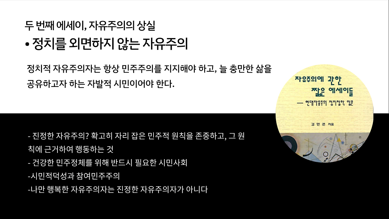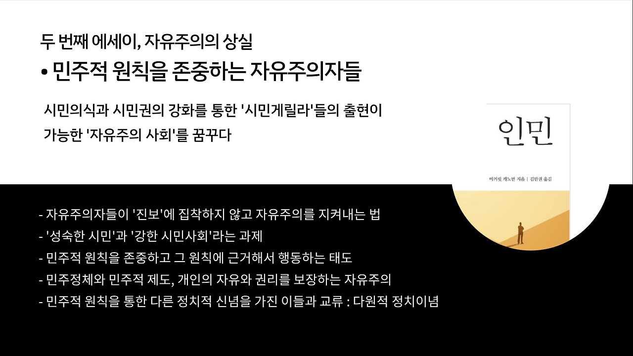 해방 이후 자유주의 정체성 혼란의 기원 | 지배 보수세력의 ‘진보’ 타이틀 쟁취전 | 진보와 자유주의를 향한 경멸 | 자유주의자 없는 자유주의 진보 담론 | 민주적 원칙을 존중하는 자유주의자들 | 정치를 외면하지 않는 자유주의자들 | 민주정체의 토대가 되는 자유주의자들