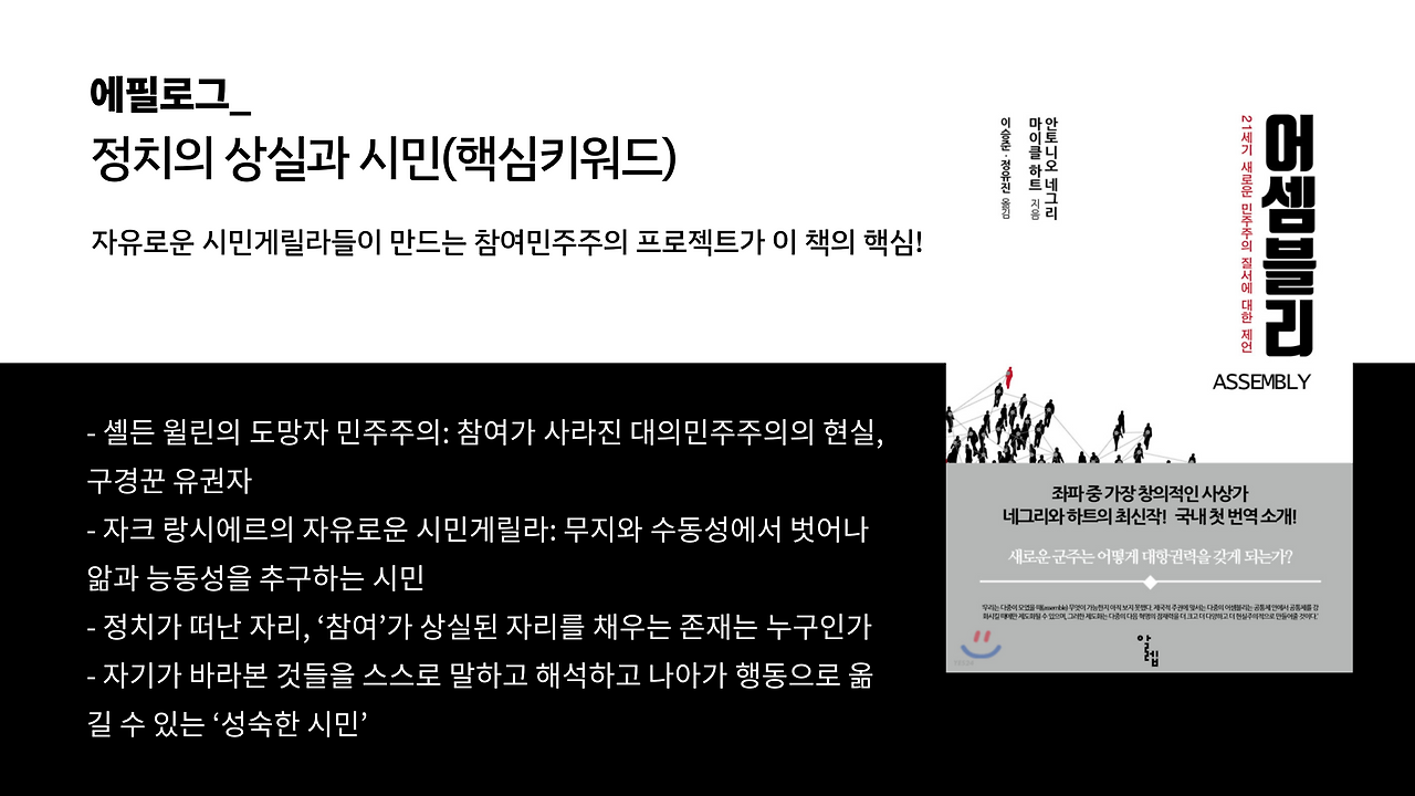 지은이는 ‘에필로그’에서(이 책은 지금의 현실이 끝이기를, 그리고 이 책이 새로운 시작이 되기를 바라는 마음에서, ‘에필로그’에서 시작해 ‘프롤로그’로 끝맺는 형식으로 구성되어 있다) ‘도망자 민주주의’(fugitive democracy)와 ‘자유로운 시민게릴라’라는 개념을 이 책을 관통하는 핵심적인 두 개의 키워드로 제시하고 있다. ‘도망자 민주주의’는 미국의 정치철학자인 셸든 월린(Sheldon Wolin)이 대의민주주의의 현실을 은유적으로 내보인 표현으로, 오늘날 민주정체에서 시민의 참여란 혁명 혹은 시민적 저항이라는 일시적인 순간에만 존재할 뿐이고, 이런 모습은 정치가 일상으로 접어들기 시작하면 재빨리 모습을 감춘다는 것이다. 대부분의 정치이론가들이나 철학자들은 이렇게 민주주의가 도망쳐 버린 자리에 남은 시민들의 모습을, 자신이 뽑은 정치엘리트에게 모든 것을 맡겨 놓고 무언가를 해주기를 바라거나, 때로는 정치 자체에 무관심한 ‘구경꾼’으로 그려 낸다.