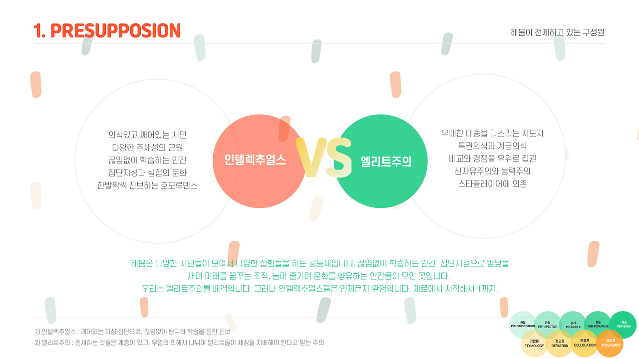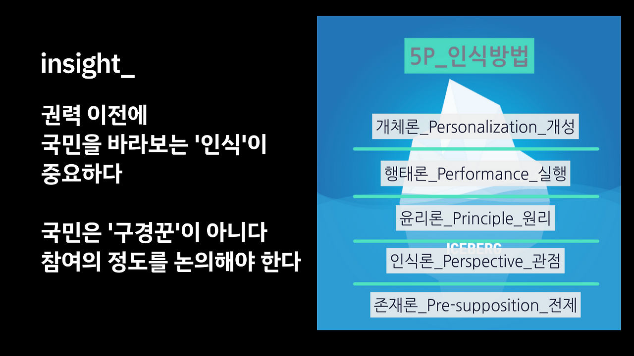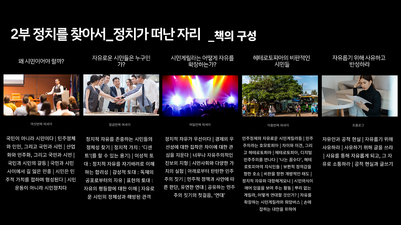 정치적 자유를 존중하는 시민들의 정체성 찾기 | 정치적 가치 : ‘디센트’(를 할 수 있는 용기) | 이성적 토대 : 정치적 자유를 자기배려로 이해하는 합리성 | 감성적 토대 : 독재의 공포로부터의 자유 | 표현의 토대 : 자유의 평등함에 대한 이해 | 자유로운 시민의 정체성과 해방된 관객