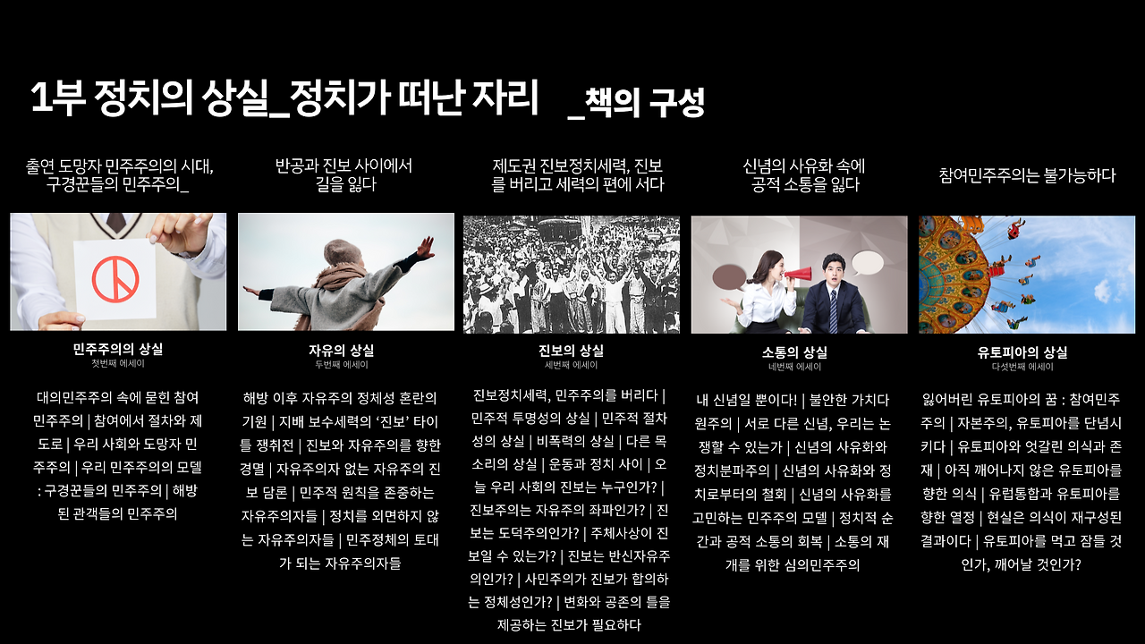 진보정치세력, 민주주의를 버리다 | 민주적 투명성의 상실 | 민주적 절차성의 상실 | 비폭력의 상실 | 다른 목소리의 상실 | 운동과 정치 사이 | 오늘 우리 사회의 진보는 누구인가? | 진보주의는 자유주의 좌파인가? | 진보는 도덕주의인가? | 주체사상이 진보일 수 있는가? | 진보는 반신자유주의인가? | 사민주의가 진보가 합의하는 정체성인가? | 변화와 공존의 틀을 제공하는 진보가 필요하다