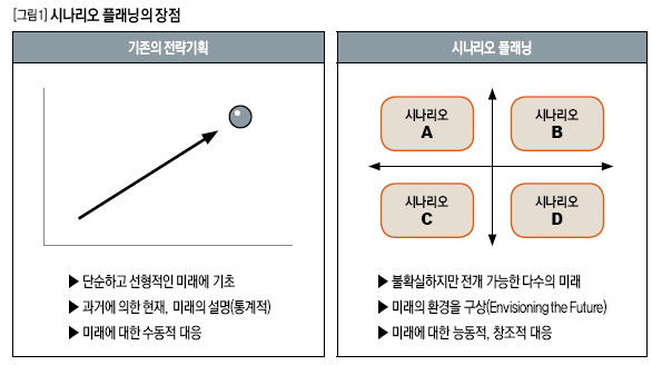 시나리오 플래닝: 서로 다른 전제와 변수에 따라 여러 미래 시나리오를 설계.
