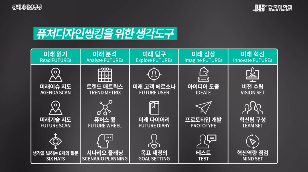 또한 시나리오 플래닝은 불확실한 미래 조건에 대해 복수의 전제와 변수를 설정하고, 이들 조합을 통해 다양한 미래 시나리오를 구성하는 방식이다. 이는 단순히 예측이 아니라 전략적 상상이며, 각 시나리오에 따른 리스크, 기회, 정책 대안을 사전에 준비할 수 있도록 한다. 미래 휠은 특정 사건이나 트렌드가 사회 전체에 미치는 영향을 도식적으로 시각화하는 도구로서, 연쇄적이고 비선형적인 영향을 추적하는 데 유용하다. 예를 들어 AI 기술의 도입이 일자리, 교육, 법률, 문화, 윤리 등에 어떤 파급 효과를 일으킬지를 구조화하는 데 효과적이다. 이 외에도 STEEP 분석은 사회(Social), 기술(Technological), 경제(Economic), 환경(Environmental), 정치(Political)의 다섯 영역을 중심으로 미래의 변화 요인을 정리하며, 복합적인 변화 맥락을 다차원적으로 이해할 수 있도록 한다.