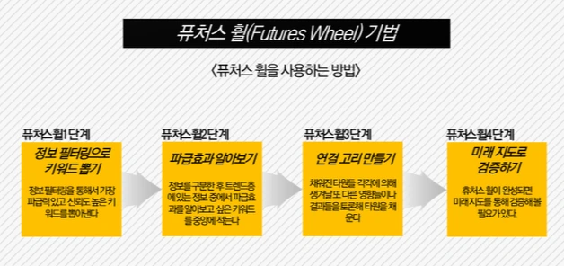퓨처 휠(Futures Wheel)이란 미래의 변화 요소가 사회, 기술, 경제, 환경, 정치 등 다양한 영역에 어떤 직·간접적 영향을 미칠 수 있는지를 시각적으로 분석하는 도구이다. 1971년 미래학자 제롬 글렌(Jerome C. Glenn)이 개발한 이 기법은 단일 사건이나 변화가 여러 방향으로 파급되는 구조를 도식화함으로써, 변화의 복잡한 영향을 단계별로 이해하고 대응 전략을 수립하는 데 유용한 방법으로 평가된다.