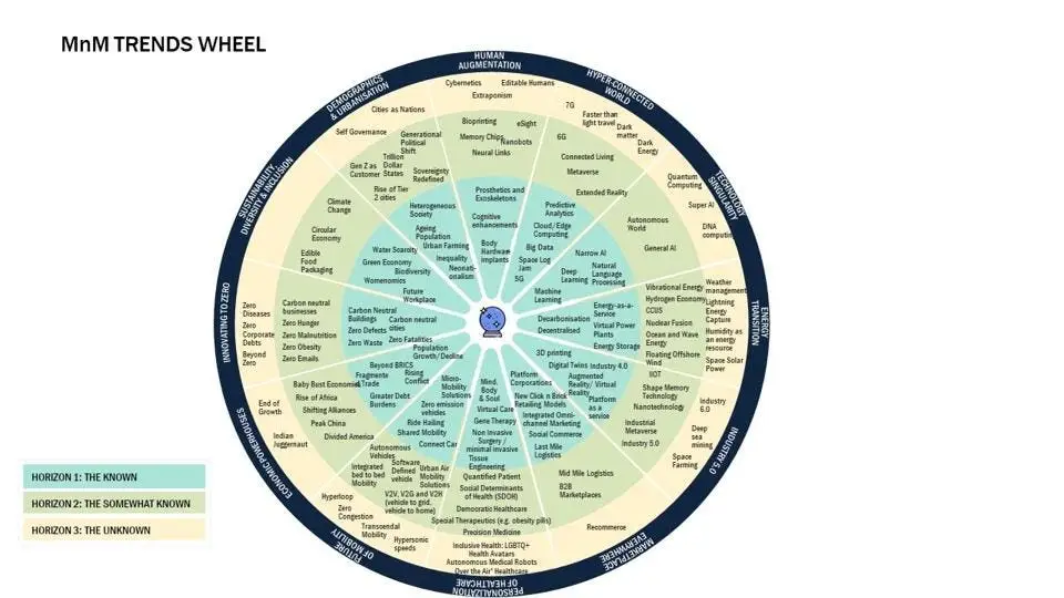퓨처휠(Futures Wheel): 한 가지 사건이나 변화가 파급적으로 어떤 영향을 끼칠지를 다층적으로 도식화.