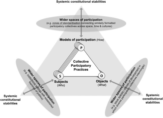 이러한 세 접근을 종합하여 저자들은 ‘참여 생태계(ecologies of participation)’라는 개념을 제시한다. 이는 단일한 주체, 대상, 형식이 아니라, 세 가지 상호작용적 차원―① 집합적 실천(collective practices), ② 참여 공간(wider spaces of participation), ③ 시스템 헌법(system-as-constitution)―으로 구성된다고 설명한다. 첫째, 참여는 개별 행위가 아니라 사회-물질적 구성요소(기술, 제도, 사람, 의미 등)가 얽혀 작동하는 집합적 실천을 통해 이루어진다. 둘째, 이러한 실천들은 단절된 것이 아니라, 특정한 제도, 담론, 정체성에 따라 서로 연결되며, 공통의 ‘참여 공간’을 형성한다. 예를 들어, ‘시민 배심원’, ‘여론조사’, ‘행동변화 캠페인’ 등은 표준화된 방식으로 재생산되며 공통된 형식을 공유한다. 셋째, 이러한 모든 참여는 특정한 정치문화적 헌법―즉, 국가와 과학, 시장, 시민의 관계를 규정하는 역사적·제도적 조건―안에서 정당화되고 의미화된다.
