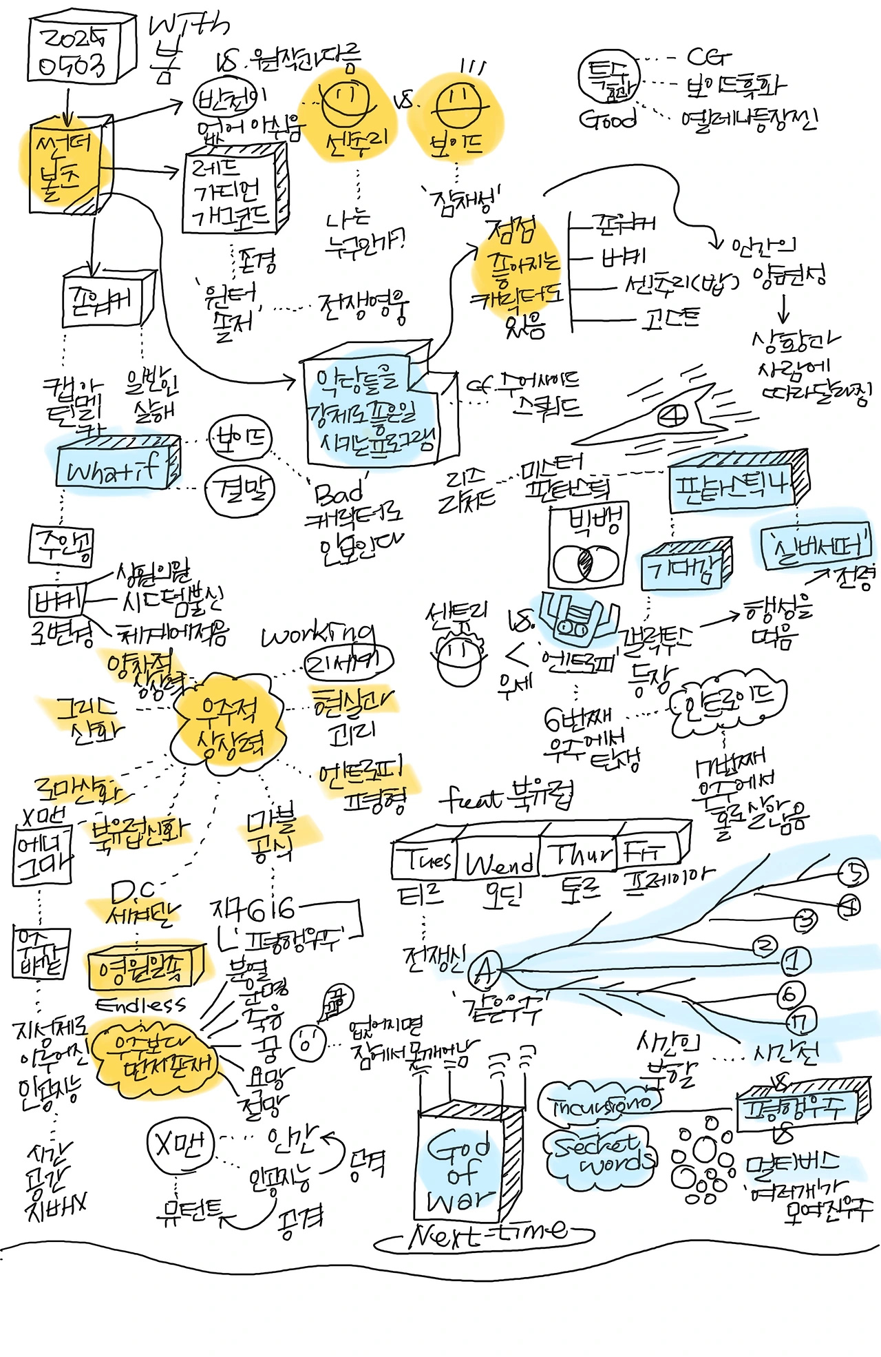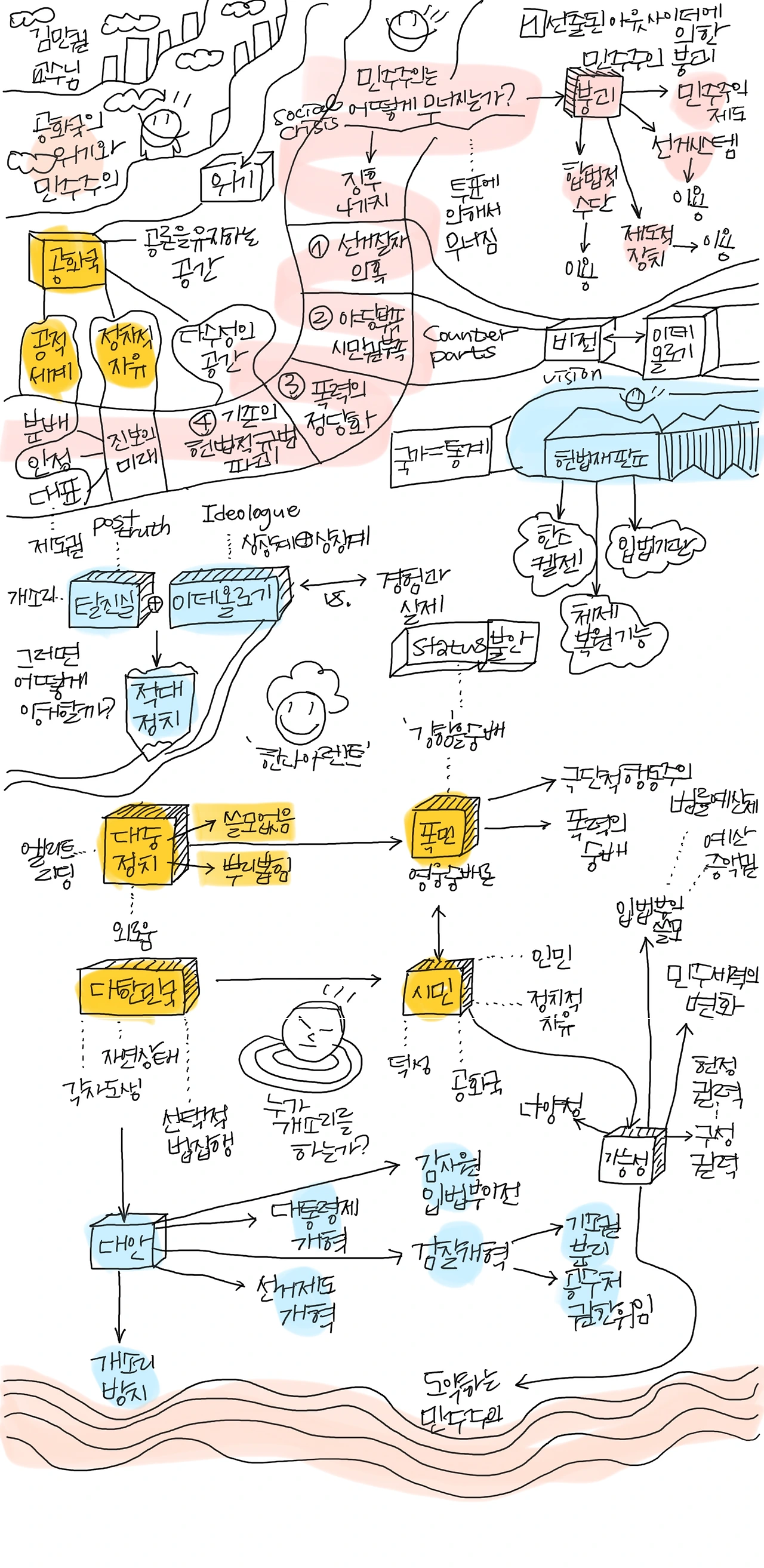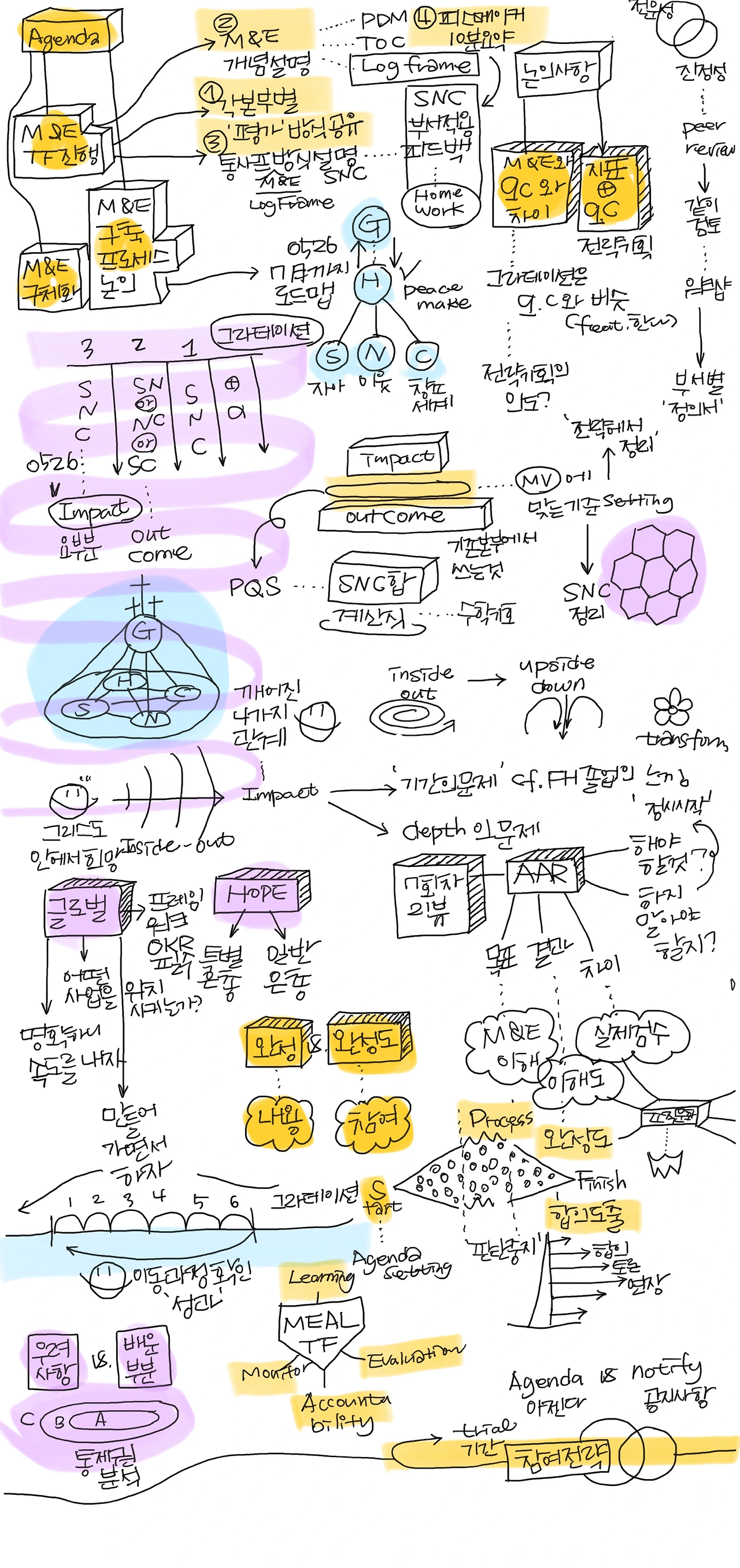 이번 그림일기는 양이 매우 많다. 생각을 해야하는 시간이 많았기 때문이다. 글로 옮기는 것은 상당한 시간이 걸리지만 그림으로 남기는 것은 항상 할 수 있기 때문에, 생각이 너무 많이 흘러가는 시기에는 그림으로 남겨 놓는다. 거의 3달동안 예배와 회의 그리고 다양한 모임에 참여했다. 특히 '영성'에 조금 더 집중했다. 지금까지 '세속화'와 '대안'에 너무 집중한 나머지 '영성'에 그렇게 깊게 집중하지 못했기 때문이다. 그래서 예배 시간에 항상 기록하고 고민하고 성찰하던 것들이 3달이 되니 상당히 많이 남았다. 그리고 전략기획팀에서 일하면서 매일매일 회의를 하고 있고, 회의에서는 시각화가 가장 중요하다는 것을 깨닫고 있는 중이다. 이렇게 패드에도 그리지만 화이트보드에도 그리고 서로 공유한다. 이렇게 시각화가 잘 쓰일지는 몰랐다. 그래서 감사하기도 하고 즐겁기도 하고 또 매번 빈 공백을 매워나가는 즐거움이 있다. 박문호 교수님의 강의가 거의 내가 지금 하고 있는 것들을 말해주는 것도 같다. 앞으로 조금 더 집중해서 해보자.