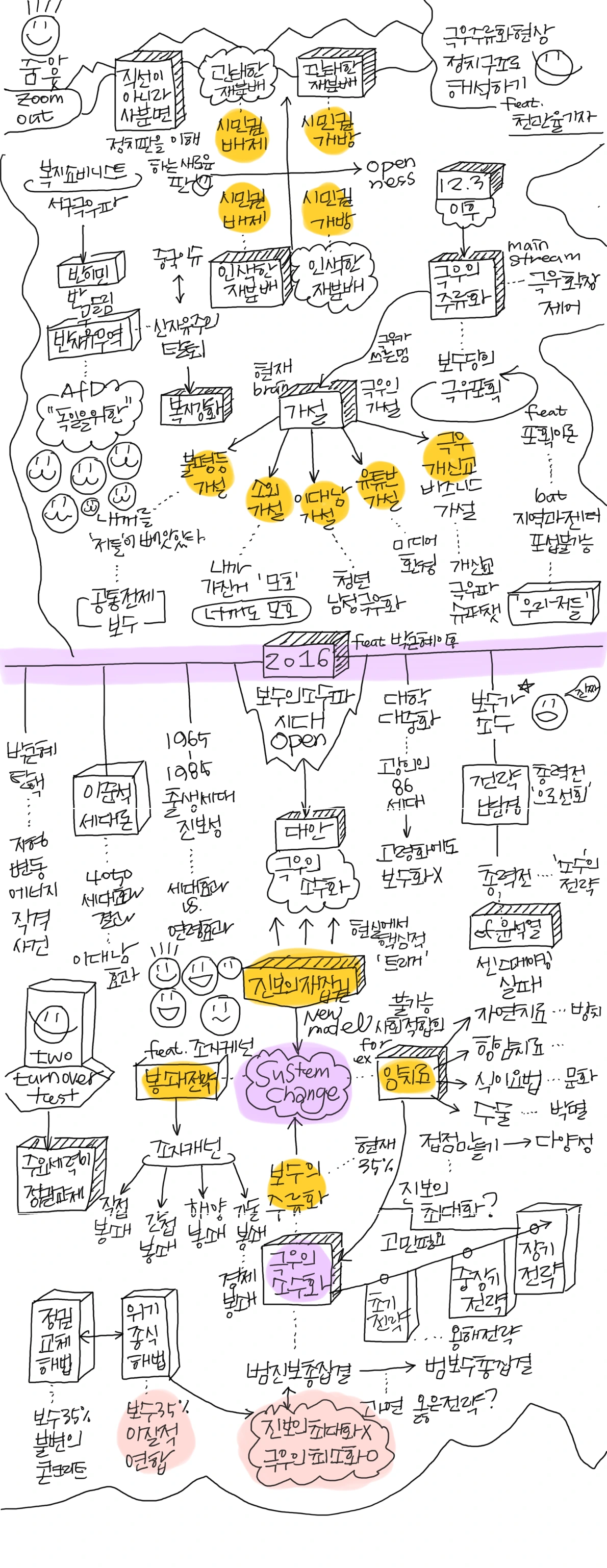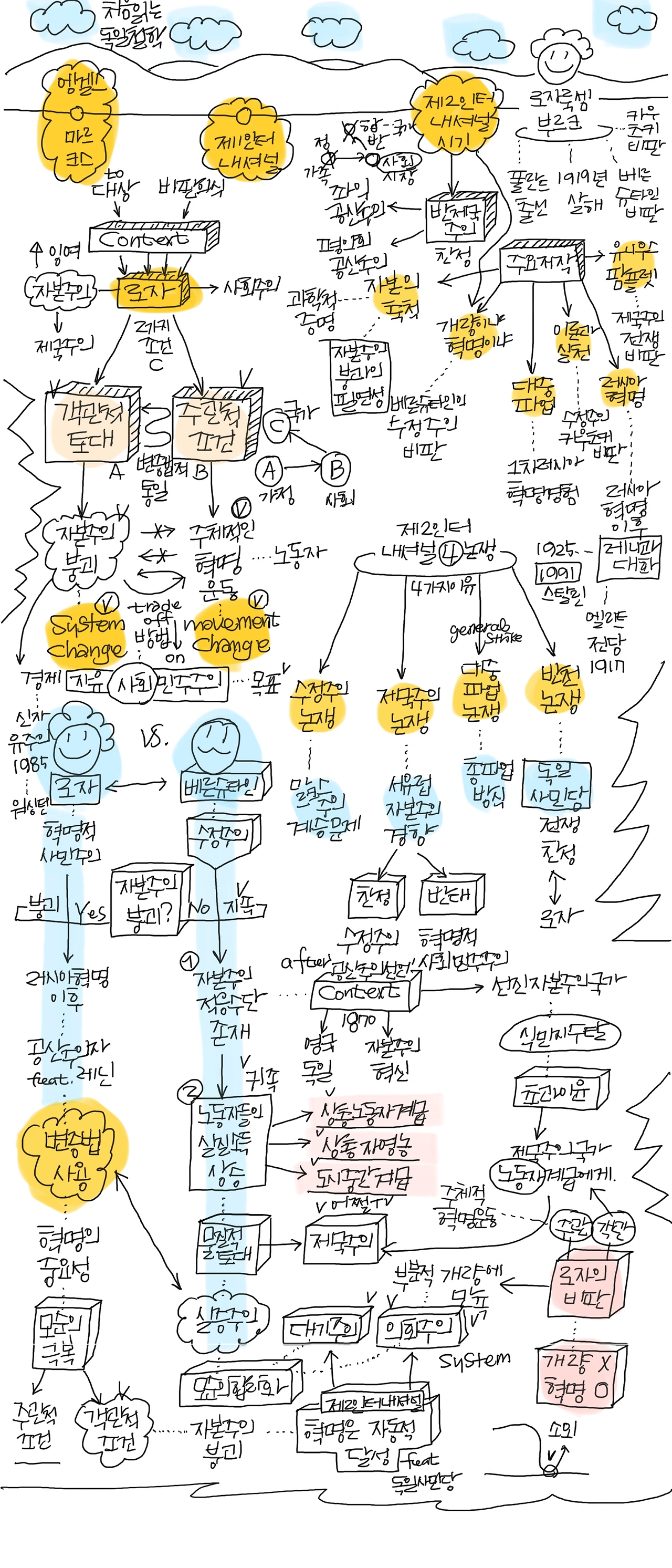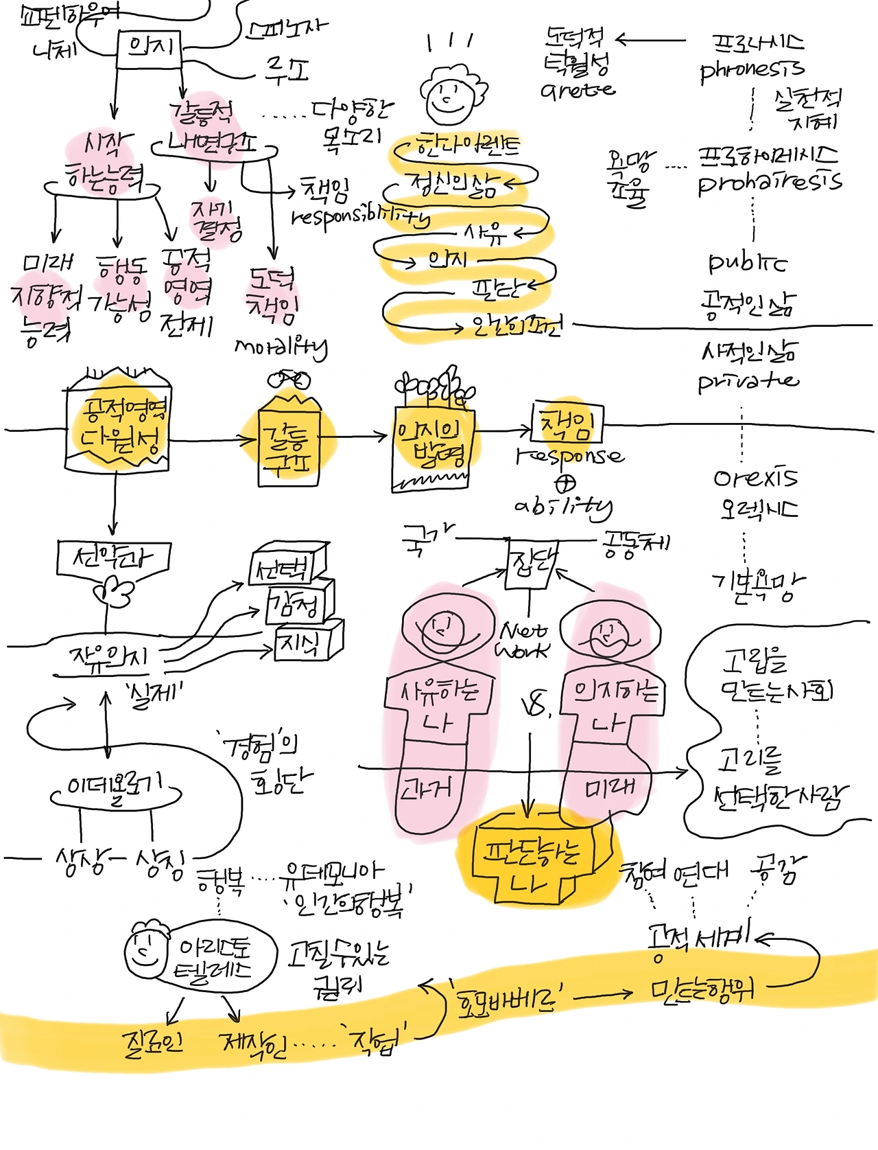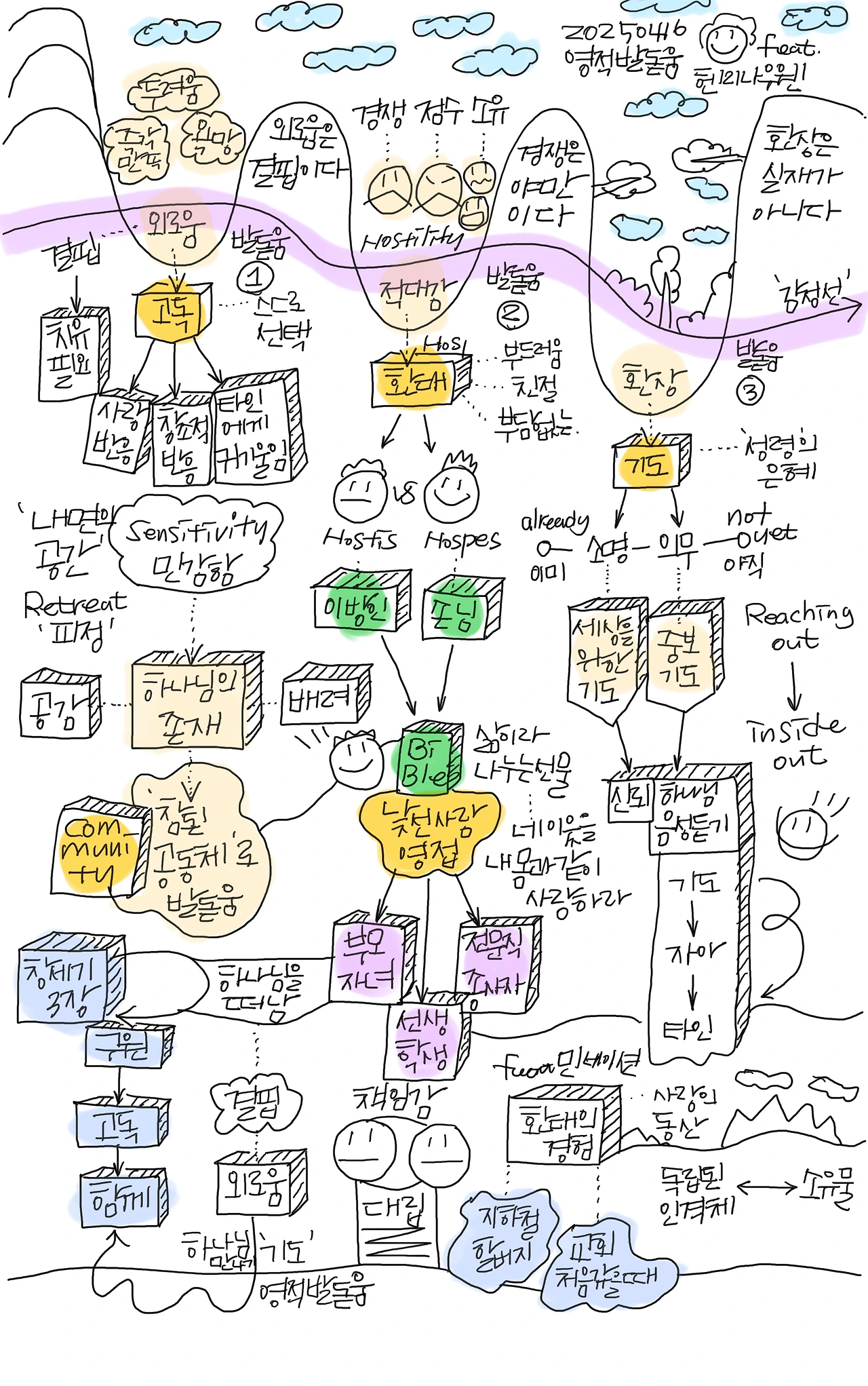 이번 그림일기는 양이 매우 많다. 생각을 해야하는 시간이 많았기 때문이다. 글로 옮기는 것은 상당한 시간이 걸리지만 그림으로 남기는 것은 항상 할 수 있기 때문에, 생각이 너무 많이 흘러가는 시기에는 그림으로 남겨 놓는다. 거의 3달동안 예배와 회의 그리고 다양한 모임에 참여했다. 특히 '영성'에 조금 더 집중했다. 지금까지 '세속화'와 '대안'에 너무 집중한 나머지 '영성'에 그렇게 깊게 집중하지 못했기 때문이다. 그래서 예배 시간에 항상 기록하고 고민하고 성찰하던 것들이 3달이 되니 상당히 많이 남았다. 그리고 전략기획팀에서 일하면서 매일매일 회의를 하고 있고, 회의에서는 시각화가 가장 중요하다는 것을 깨닫고 있는 중이다. 이렇게 패드에도 그리지만 화이트보드에도 그리고 서로 공유한다. 이렇게 시각화가 잘 쓰일지는 몰랐다. 그래서 감사하기도 하고 즐겁기도 하고 또 매번 빈 공백을 매워나가는 즐거움이 있다. 박문호 교수님의 강의가 거의 내가 지금 하고 있는 것들을 말해주는 것도 같다. 앞으로 조금 더 집중해서 해보자.