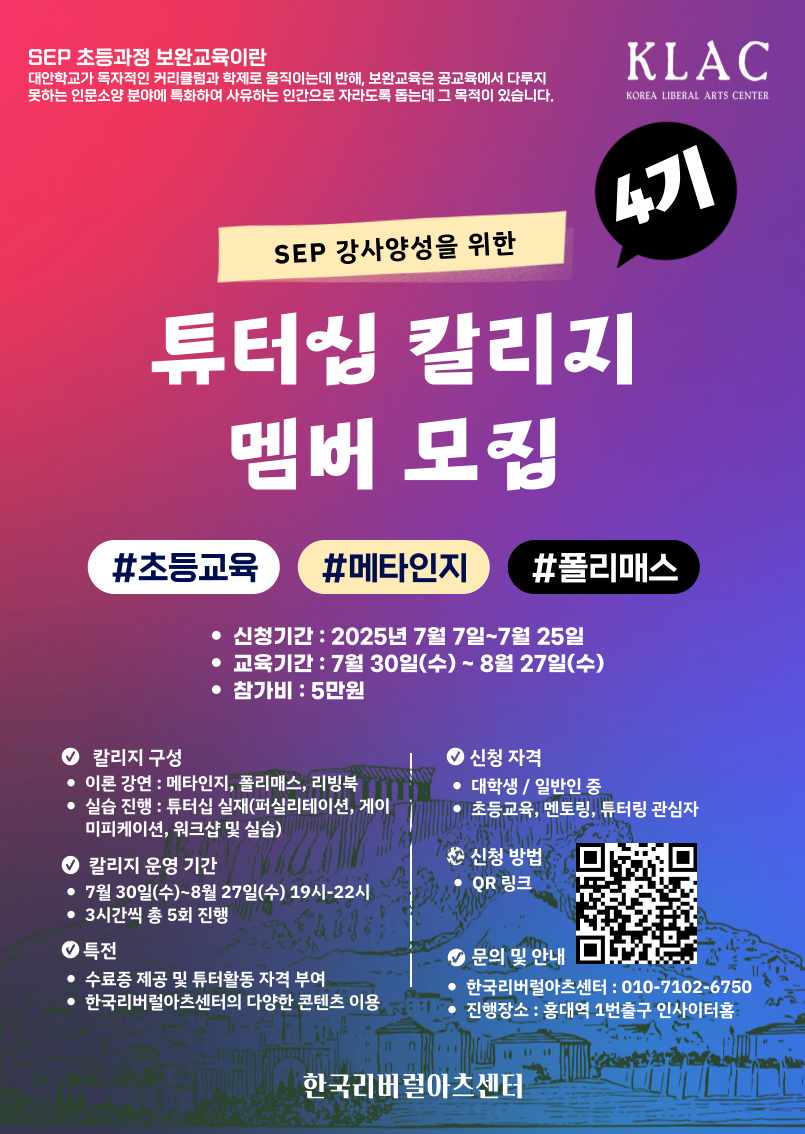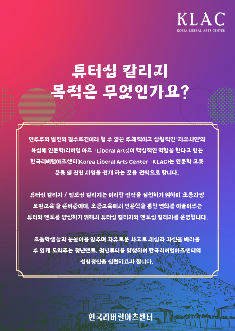 한국리버럴아츠센터와 함께한지 4년이다. 그리고 6월부터 센터장이 되었다. 한국리버럴아츠센터는 한국사회에 인문학정신을 부활시키려는 운동이라고도 할 수 있다. 다소 구성원들에 비해서 어린나이에 센터장이 되어서 앞으로 이끌어갈 생각을 하니 두근거리기도 하고 책임감도 느껴진다. 튜터십칼리지 4기를 모집하고 있다. 한국사회에 리버럴아츠 정신을 확산하려면 어디서부터 시작해야 할까? 한국사회에 '리버럴아츠'의 운동을 시작하고 누구나 인간답게 생각하고 민주적으로 말하고 행동할 수 있도록 도움을 줄 수 있는 그런 기회들을 마련하고자 한다. 이번에 다시 튜터십을 기획했고 진행한다. 메타인지, 폴리매스, 리빙북과 같은 새로운 개념들을 쉽고 즐겁게 강의하고 워크샵으로 진행한다. 누구나 신청할 수 있다. 여전히 내게 풀리지 않는 숙제. 가난과 싸우는 것을 어떻게 풀어내야 할지 고민 중이다.