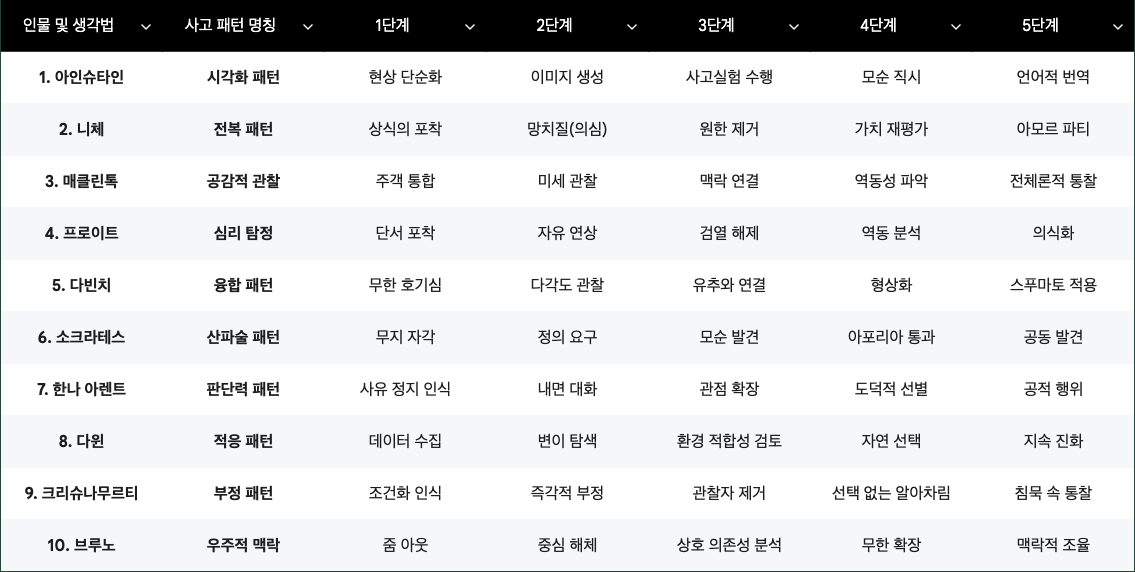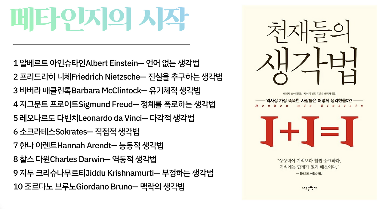 그러니깐 메타인지에 관련된 생각을 하게된 이유는 바로 이 책 때문이다. 한국에서는 '천재들의 생각법'으로 표현되어 있지만 독일어로는 '아인슈타인처럼 생각하기'이다. 아인슈타인은 역사상 가장 천재로 알려져 있지만 어떻게 생각하는지는 세간에 알려지지 않았다. 그러나 이 책에서는 아인슈타인과 같은 천재들이 어떻게 생각하는지에 대해서 10가지의 접근을 제안해서 신선하다. 더욱이 학업이 늦은 아이들이나 아이큐가 높지 않은 아이들이 어떻게 하면 쉽게 학교공부를 따라는 것을 넘어서 재미있게 공부할 수 있을까를 공부하다 보니 이 책 만한게 없다는 생각이 들었다. 요약하자면 테레자 보이어라인의 '천재들의 생각법'은 시대를 초월한 위대한 인물들이 어떻게 남들과 다른 방식으로 사고했는지를 분석하여, 우리에게 더 깊은 통찰력을 선사하는 책이다. 이 책에서 제시하는 10가지 천재들의 생각법은 다음과 같다. 안그래도 메타인지에 대한 책을 쓰고 있던 차에 이번에 정리해보자는 생각에 정리해보았다.