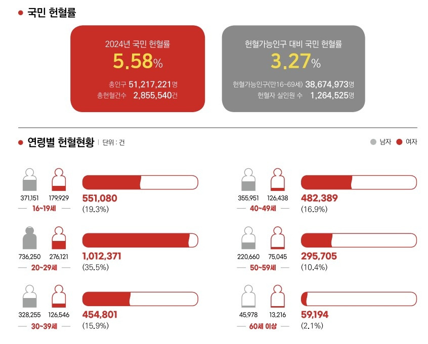 한국사회의 헌혈 비율은 전반적으로 감소하는 추세를 보이고 있다. 대한적십자사의 통계에 따르면, 지난해 헌혈에 참여한 실제 인원은 126만 4,525명으로 20년 만에 최저치를 기록했으며, 헌혈 가능 인구 대비 비율은 3.27% 수준이다.