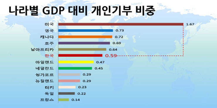 GDP 대비 개인 기부금 순위는 조사 기관마다 순위가 다소 다를 수 있다. 2022년 영국 자선지원재단(CAF)이 발표한 세계기부지수에 따르면, 한국은 119개국 중 88위로 하위권에 속한다. 기부 선진국으로 꼽히는 미국의 경우 3위, 호주는 4위를 기록했으며 중국은 49위이다. 일본은 118위로 최하위권이다. 한국의 GDP 대비 민간 기부 비중은 2011년 0.79%에서 2021년 0.75%로 거의 정체 상태이며, 같은 기간 미국의 GDP 대비 기부 비중은 1.9%에서 2.2%였다.이는 한국의 기부 참여율이 지속적으로 하락하고 있기 때문인 것으로 분석된다. 그럼에도 불구하고 한국에서는 기부금의 추이가 GDP와 비례적이라는 것이다. 경기가 좋아지면 사람들은 더 기부하려고 한다는 것을 볼 수 있다.