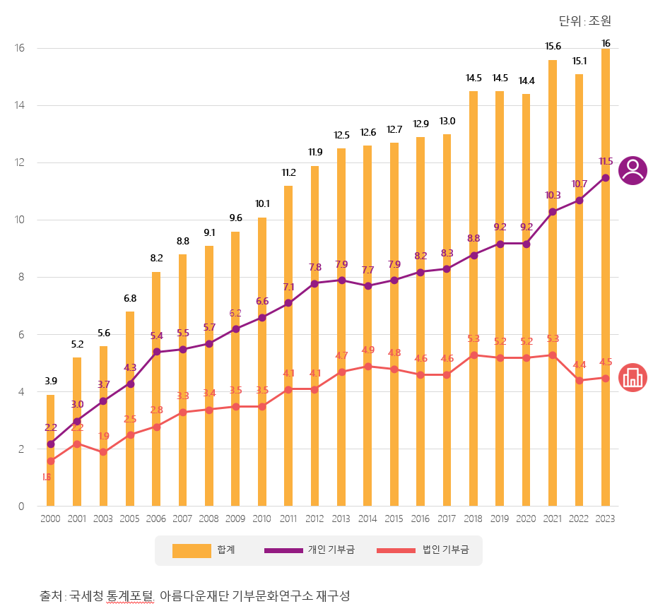 한국의 기부금 추이에는 몇 가지 뚜렷한 특징이 있다.