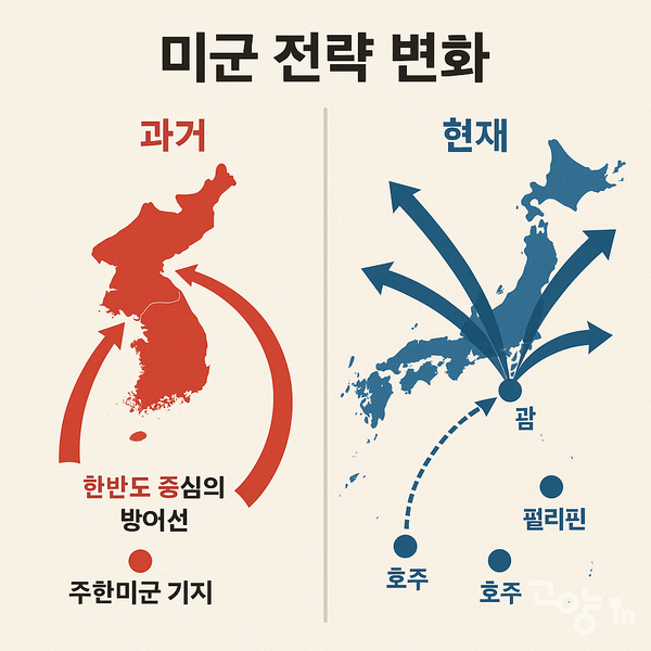 한반도는 역사적으로 지정학적 요충지로 여겨져 왔지만, 오늘날에는 단순히 북한 문제에 국한되지 않고 미국의 작전과 군수 지원을 위한 동북아 전략 허브 기지로 발전하였다. 일본과 중국 본토 사이에 놓여 있는 지리적 특성 때문에, 한반도는 동북아시아의 세력 균형을 결정짓는 데 있어 필수적이다. 특히 중국이 서태평양으로 세력을 확장하려는 상황에서, 미국에게 한반도는 중국의 팽창을 견제하고 억제할 수 있는 핵심 지점으로 자리매김한다. 미국은 한국을 단순히 방어 대상국이 아니라, 인도·태평양 전략을 수행하는 데 있어 필수적인 거점으로 간주하며, 이를 통해 북한 도발 억지와 중국 견제를 동시에 달성하려 한다.