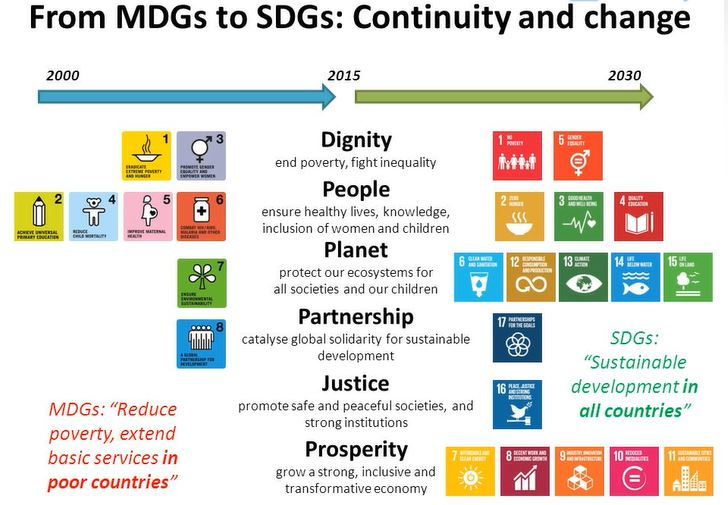 MDGs의 성과와 한계를 바탕으로, 2015년에는 지속가능 개발 목표(SDGs)가 채택되면서 개발 패러다임은 한 단계 더 진화했다. SDGs는 17개 목표와 169개 세부 목표를 통해 빈곤, 불평등, 기후 변화, 평화, 혁신 등 사회, 경제, 환경의 다차원적인 문제를 통합적으로 다룬다. 특히 SDGs는 모든 국가(선진국 포함)에 적용되는 보편적인 목표이며, 포용성과 글로벌 파트너십을 강조함으로써 개발을 더욱 포괄적인 개념으로 확장했다. 현재의 개발 프로젝트는 기후 회복력 강화, 불평등 해소, 혁신 기술 도입 등에 초점을 맞춘 효과적인 개발 협력에 중점을 두고 있다.