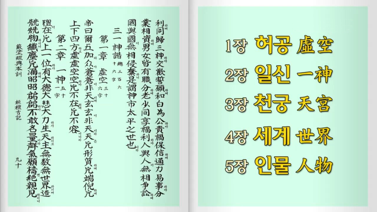 1장 장천훈(天訓)하늘의 본체: 하늘은 형체도 끝도 없는 무궁한 존재이며 어디에나 있다.