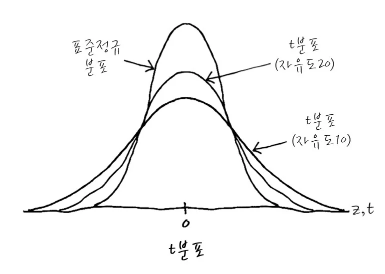 t-분포는 모집단에 대한 정보가 불완전한 상황에서 인간이 내릴 수 있는 최선의 판단을 고민한 인식론적 성찰에서 기원한다. 모집단의 표준편차를 알 수 없을 때 표본의 정보를 활용하여 추론하는 과정에서 발생하는 추가적인 불확실성을 고려한다. 정규분포와 유사한 종 모양을 띠지만 양 끝의 꼬리 부분이 더 두껍게 설계되어 표본 오차의 위험을 보수적으로 수용한다. 이는 표본의 크기가 작을수록 불확실성이 커진다는 사실을 수학적인 자유도의 개념으로 반영한 결과다. 표본이 충분히 커지면 결국 정규분포로 수렴하며 이는 지식의 축적이 불확실성을 제거해가는 과정을 상징한다. 정규분포가 이상적인 상태를 가정한다면 t-분포는 우리가 처한 현실적인 제약을 인정한 상태에서의 추론을 가능하게 한다. 실제로는 소표본의 평균 차이를 검정하거나 신뢰구간을 설정할 때 표준적인 도구로 사용된다. 결국 t-분포는 인간 지식의 한계를 데이터 구조에 내면화한 지혜로운 판단의 근거다.