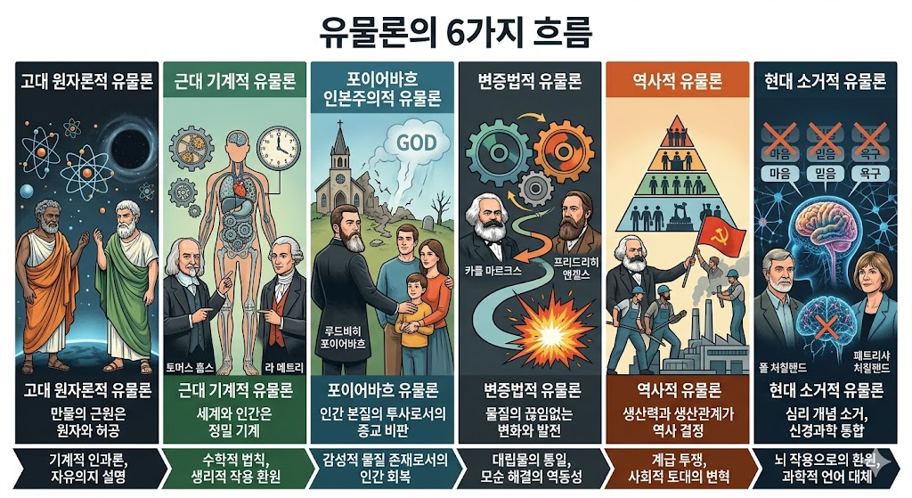 근대 기계적 유물론은 자연과 인간을 수학적 법칙으로 계산 가능한 대상으로 파악함으로써 근대 문명의 비약적인 발전을 이끌어냈다. 그러나 이들은 사물을 고립된 상태로만 관찰하며 사물 내부에 존재하는 역동적인 변화의 원인을 충분히 설명하지 못했다. 모든 변화를 외부의 충격에 의한 위치 이동으로만 설명하려 했기에 질적인 도약이나 발전의 과정을 놓치는 한계를 보였다. 이 때문에 훗날 마르크스주의자들에 의해 '형이상학적이고 고정적인 유물론'이라는 비판을 받으며 변증법적 유물론에 자리를 내주게 된다. 그럼에도 불구하고 기계적 유물론이 정립한 물질적 인과율은 현대 과학 방법론의 확고한 표준으로 자리 잡았다. 인간을 자연의 일부로 보고 객관적인 법칙을 찾아내려 했던 이들의 경로는 합리주의 정신의 정수라고 할 수 있다. 오늘날 우리가 뇌 과학이나 유전공학을 통해 인간을 이해하려 하는 시도 역시 기계적 유물론의 경로와 맞닿아 있다. 근대의 유물론자들은 보이지 않는 영혼의 신비 뒤에 숨겨진 육체와 물질의 정교한 매커니즘을 세상 밖으로 드러냈다.