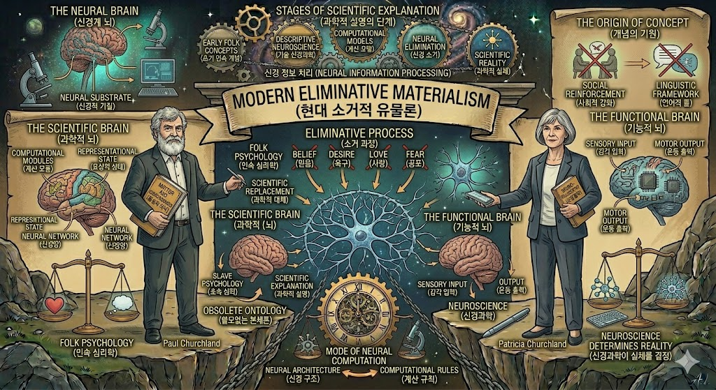 현대 유물론의 한 갈래인 소거적 유물론은 신경과학의 성과를 바탕으로 우리의 전통적 마음 개념을 근본적으로 부정하는 급진적 입장을 취한다. 폴 처칠랜드와 패트리샤 처칠랜드는 우리가 흔히 쓰는 '믿음', '욕구', '고통' 같은 심리학적 용어들이 사실은 실체가 없는 가공의 이론이라고 주장한다. 이들은 이를 '민간 심리학(Folk Psychology)'이라 부르며 연금술이나 천동설처럼 과학의 발전에 따라 폐기되어야 할 낡은 유산으로 본다. 인간의 정신 현상은 뇌라는 물질적 기관에서 일어나는 복잡한 신경 세포들의 신호 전달과 화학 반응의 산물일 뿐이다. 따라서 우리가 느끼는 주관적 감정은 사실 특정 뉴런의 발화 패턴이나 호르몬의 농도 변화로 완전히 설명될 수 있다. 소거적 유물론의 경로는 철학적 사유를 넘어서 뇌 과학적 사실로 모든 정신적 수수께끼를 해결하려는 극단적 물리주의의 길이다. 미래에는 "나는 당신을 사랑한다"는 표현 대신 특정한 신경 전달 물질의 작용을 언급하는 과학적 언어가 세상을 지배할 것이라고 예측한다.
