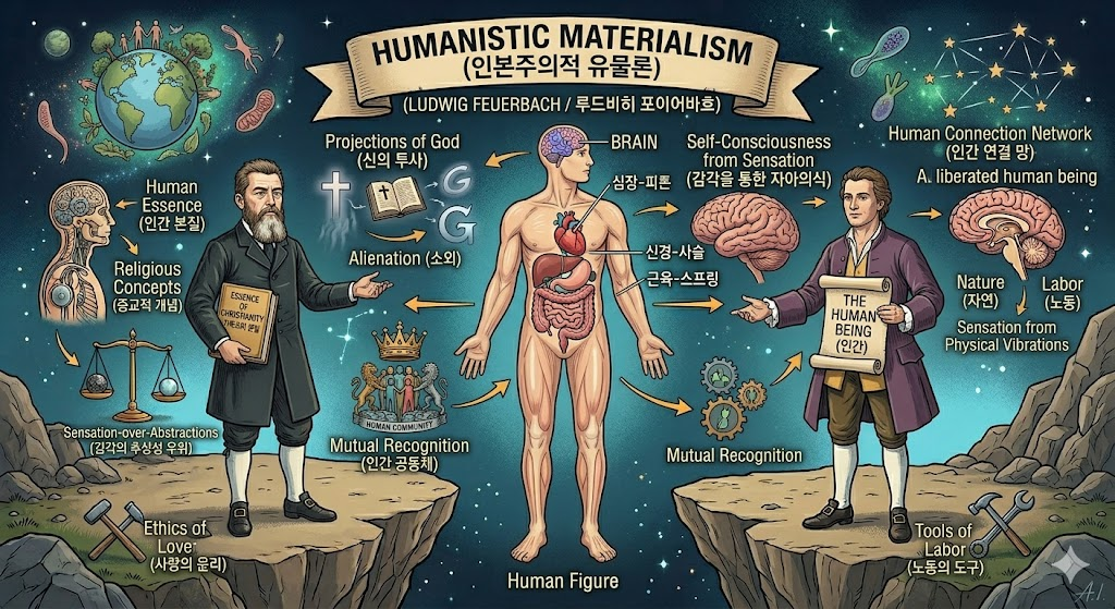 루드비히 포이어바흐는 헤겔의 절대관념론이라는 거대한 산맥을 무너뜨리고 철학의 중심을 하늘(정신)에서 땅(인간)으로 옮겨놓았다. 그는 정신이 물질을 창조하는 것이 아니라 현실의 구체적인 인간이 사유의 주체라는 사실을 명확히 함으로써 유물론의 새로운 전기를 마련했다. 헤겔 철학이 신학을 철학적 용어로 포장한 것에 불과하다고 비판하며 인간의 감성적 삶을 철학의 최고 원리로 세웠다. 포이어바흐는 인간을 추상적인 '자아'가 아니라 고통을 느끼고 사랑을 갈구하며 음식을 먹는 '감성적 존재'로 규정했다. "인간은 그가 먹는 바로 그것이다"라는 그의 유명한 문장은 인간의 물질적 기반을 극단적으로 강조한 사례로 꼽힌다. 그는 관념론적 사유가 인간을 자기 자신으로부터 소외시킨다고 보았으며 인간 본연의 감각적 현실을 회복할 것을 주장했다. 포이어바흐의 경로는 신비화된 관념의 세계를 인간의 구체적인 생활 세계로 환원시키는 해방의 과정이었다. 그는 유물론을 단순한 물리적 이론이 아닌 인간 중심의 가치관으로 정립하며 인본주의적 색채를 강하게 부여했다.
