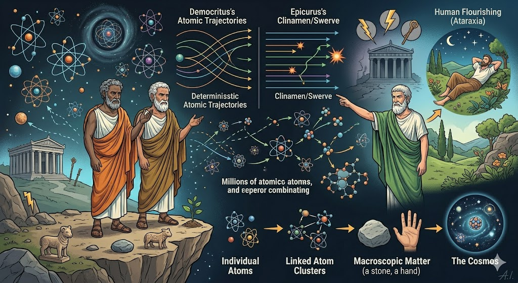 에피쿠로스는 데모크리토스의 원자론을 계승하면서도 인간의 자유의지를 설명하기 위해 '원자의 편위(Clinamen)'라는 독창적인 개념을 도입했다. 원자들이 수직으로 낙하하다가 아주 미세하게 경로를 이탈하는 이 우연성이 세상의 변화와 인간의 선택을 가능하게 한다고 본 것이다. (클리나멘의 개념에서 마르크스의 유물론이 시작되며, 요즘의 유행하는 신유물론의 원자의 행위성개념도 만들어진다.) 에피쿠로스는 신이 인간의 삶에 관여하지 않는다는 점을 강조하며 죽음에 대한 공포가 원자의 흩어짐에 대한 오해에서 비롯된다고 역설했다. 영혼 또한 미세한 원자로 구성된 물질적 존재이기에 육체의 소멸과 함께 영혼도 자연스럽게 분해되어 사라진다는 논리가 형성된다. 죽음은 우리가 존재할 때 오지 않으며 죽음이 왔을 때 우리는 존재하지 않기에 두려워할 이유가 전혀 없다는 것이다. 이러한 사유는 인간을 종교적 억압과 미신으로부터 해방시켜 마음의 평정인 '아타락시아'에 도달한다. 이러한 관점에서 에피쿠로스에게 철학은 고통 없는 평온한 상태를 유지하는 것이었다. 고대 유물론은 이처럼 자연의 이치를 깨달아 인간 삶의 질을 높이려는 윤리적 지향점과 긴밀히 연결되어 있다.