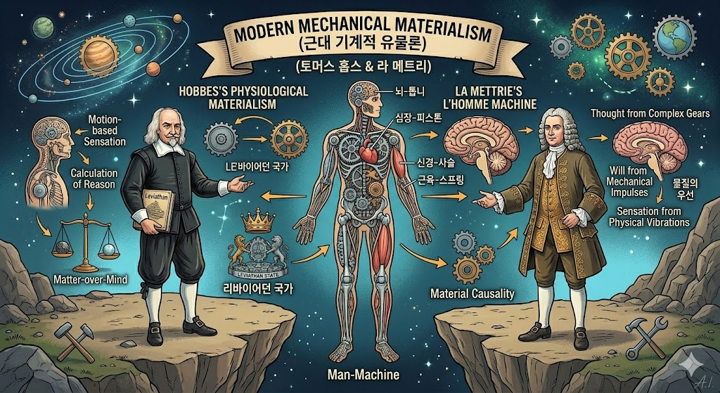 17세기 영국 철학자 토머스 홉스는 베이컨의 경험론을 계승하여 모든 존재를 '연장(extension)을 가진 물체'로 정의하며 체계적인 유물론을 구축했다. 그는 인간의 정신 활동이나 사회적 현상조차도 물질의 운동 법칙인 역학적 원리에 따라 설명될 수 있다고 굳게 믿었다. 사유는 감각 기관을 통해 들어온 물질적 자극이 뇌에서 일으키는 미세한 운동의 결과물에 불과하다는 것이 그의 핵심 주장이다. 홉스는 국가를 '리바이던'이라는 거대한 인공적 인간으로 묘사하며 사회 계약론 역시 유물론적 인간 이해에 기초했다. 인간은 본능적으로 자기 보존을 꾀하는 물질적 동기에 의해 움직이며 이는 자연 상태에서의 만인의 투쟁을 유발한다. 그는 영혼이나 천사 같은 비물질적 실체를 인정하지 않았으며 오로지 물리적 실체만이 존재론적 의미를 갖는다고 강조했다. 이러한 기계론적 관점은 당시 지배적이었던 신학적 인간관에 정면으로 도전하며 근대 정치철학의 물질적 토대를 마련했다. 그의 경로는 복잡한 사회 구조를 단순한 물질적 상호작용으로 환원하여 분석하는 철저한 일원론적 유물론의 길이었다.