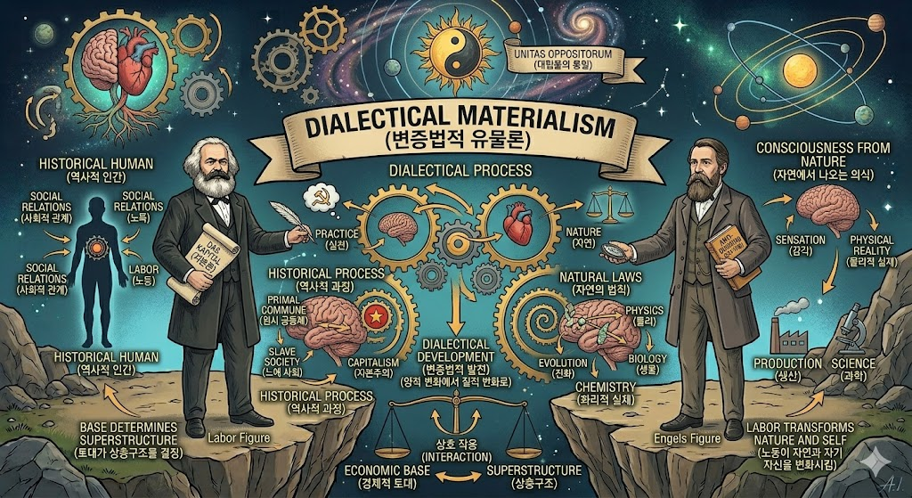 카를 마르크스와 프리드리히 엥겔스는 헤겔의 변증법과 포이어바흐의 유물론을 창조적으로 결합하여 유물론의 가장 완성된 형태를 정립했다. 물질이 정신에 우선한다는 유물론적 원칙을 고수하면서도 물질을 정지된 기계가 아닌 스스로 변화하는 역동적 실체로 파악했다. 세상의 모든 사물은 서로 연결되어 있으며 내부의 모순과 대립을 통해 끊임없이 발전하고 질적으로 도약한다는 것이 핵심이다. 헤겔의 변증법이 관념의 자기 운동이었다면 마르크스는 이를 거꾸로 세워 현실 세계의 물질적 운동 법칙으로 전환시켰다. 이들에게 물질은 단순한 고체 덩어리가 아니라 에너지와 운동, 그리고 사회적 실천이 응축된 살아있는 역사적 실체다. 변증법적 유물론은 자연과 사회의 일반적인 변화 법칙을 규명함으로써 세상에 영원한 것은 없다는 혁명적 결론에 도달한다. 모든 존재는 생성되고 소멸하며 그 과정에서 발생하는 갈등은 더 높은 단계로 나아가기 위한 필수적인 진통이다. 이들의 경로는 사물을 정적인 상태가 아닌 역동적인 과정으로 이해함으로써 철학에 강력한 생명력을 불어넣었다.