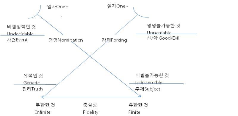 전체성을 담보하는 진리가 그 속성상 주관적이며 지엽적일 수 밖에 없는 주체에 의해 이루어진다. 이 진리와 주체를 가능하게 하는 우연성만을 자신의 유일한 질료로 삼는 사건은 항상 일어나는 것이 아니라 매우 드물고 따라서 알 수 없음을 기대하게 된다.