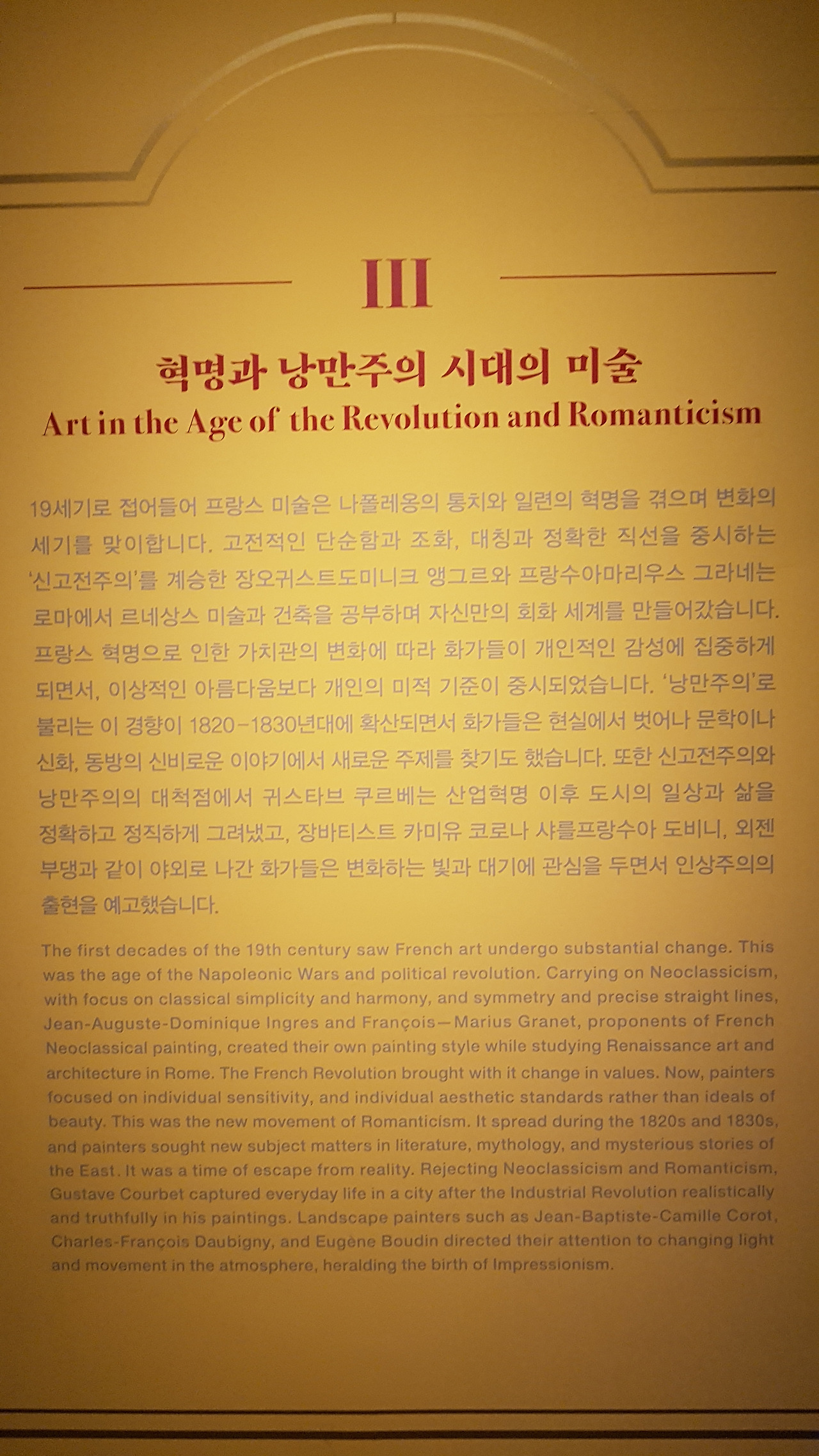 19세기로 접어들어 프랑스 미술은 나폴레옹의 통치와 일련의 혁명을 겪으며 변화의 세기를 맞이합니다. ‘신고전주의’를 계승한 화가들은 자신만의 회화 세계를 발전시켜 나갔고, ‘낭만주의’ 화가들은 현실에서 벗어나 문학이나 신화, 동방의 신비로운 이야기에서 새로운 주제를 찾기도 했습니다. 외젠 부댕, 장바티스트 카미유 코로와 같이 야외로 나간 화가들은 변화하는 빛과 대기에 관심을 두면서 이후 인상주의의 출현을 예고했습니다.