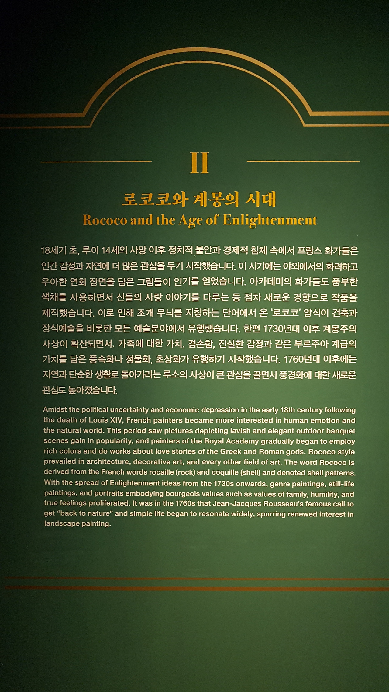 18세기 초, 루이 14세의 사망 이후 정치적 불안과 경제적 침체 속에서 야외에서 열리는 화려하고 우아한 연회 장면을 담은 그림들이 인기를 얻었습니다. 아카데미의 화가들도 풍부한 색채를 사용하면서 신들의 사랑 이야기를 다루는 등 점차 새로운 경향으로 작품을 제작했습니다. 한편 계몽주의 사상이 확산되면서 부르주아 계급의 가치를 담은 풍속화나 정물화, 초상화가 유행했고 새롭게 풍경화에 대한 관심도 높아졌습니다.