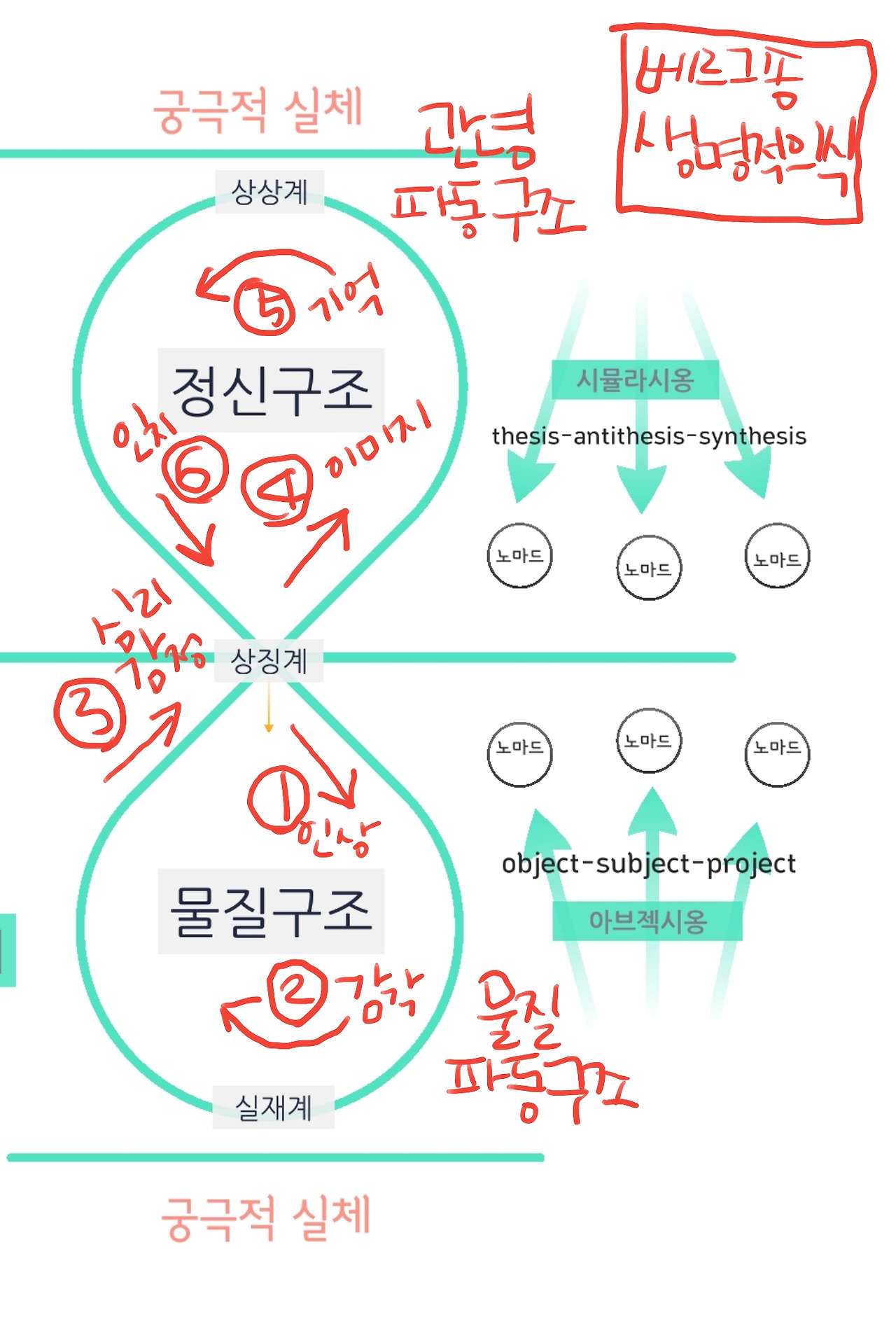 베르그송은 물질의 가장 깊은 곳에는 평면으로 존재하는 수평적인 존재론이 있고 그 존재론이 잠재성을 가지고 현실로 올라오는 과정에서 기호계적코라와 상징계적 코라를 왔다 갔다하는 파동을 만들어낸다고 말한다. 베그르송은 페러데이까지 갔다가 파동으로 다가간다. 입자로 정지해 있는 것이 아니라 파동으로 현실에서의 생명을 그려낸다. 물질은 파동을 통해서 지속하는 생명의 extention이 일어나고 이것은 물질과 함께 기억을 계속해서 만들어낸다. 그렇게 만들어낸 기억과 물질의 구조 안에서 이제서야 스피노자가 말하는 affection 개념이 나온다.