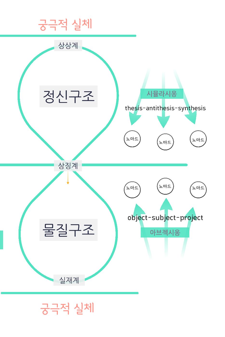관념이 순수일자에서 상징계적 코라로 내려가는 과정에서 실재와 마주치면서 일어나는 일이 있다. 현실을 마주치면서 현상이 되는 과정에서 다시 반동으로 위로올라가면서 상징계적 코라에서 시뮬라크르를 형성한다. 그래서 상징계 주변에서 사람들의 관념은 적절히 실재계와 대응하면서 전혀 대칭되지는 않지만 어느정도의 허구의 구조물을 만들고 거기에 관념을 안착시킨다. 이렇게 현실 주변에 안착한 시뮬라크르에게서 순환이 일어나는데 이게 바로 재현representation이다.