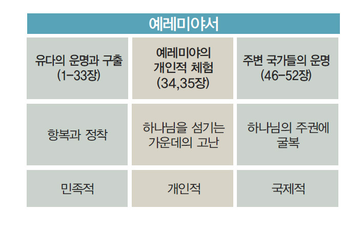 나라가 완전히 기울어가던 시기를 살면서, 예레미야는 이 민족에게 다가올 두렵고도 무서운 심판과 멸망의 날을 선포하였다. 그 시대에도 평화를 전하는 수 많은 예언자들이 있었고, 사람들이 정말 듣고 싶었던 것은 그러한 예언이었기에, 심판과 멸망을 전하는 예레미야의 삶은 이미 고난이 예견된 것일 수 밖에 없었다.