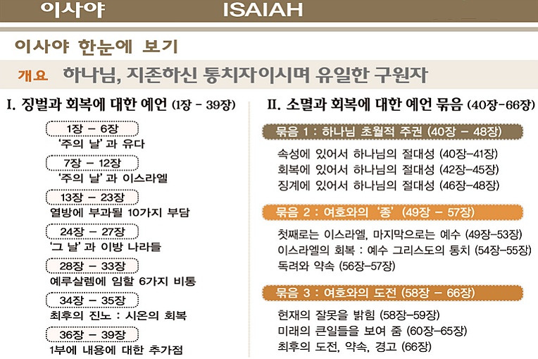이사야서가 쓰인 목적은 무엇인가?이사야서의 저자는 누구인가? 이사야인가? 제2의 이사야, 제 3의 이사야가 있는가?동시대를 살아가는 선지자들을 전제로 할 때 그들이 현실에서 겪어야 했을 모욕과 기대는 어떤 것일였을까? 묵시와 예연을 어떤 지점에서 바라보고 해석하는가에 따라서 완전히 달라진다.