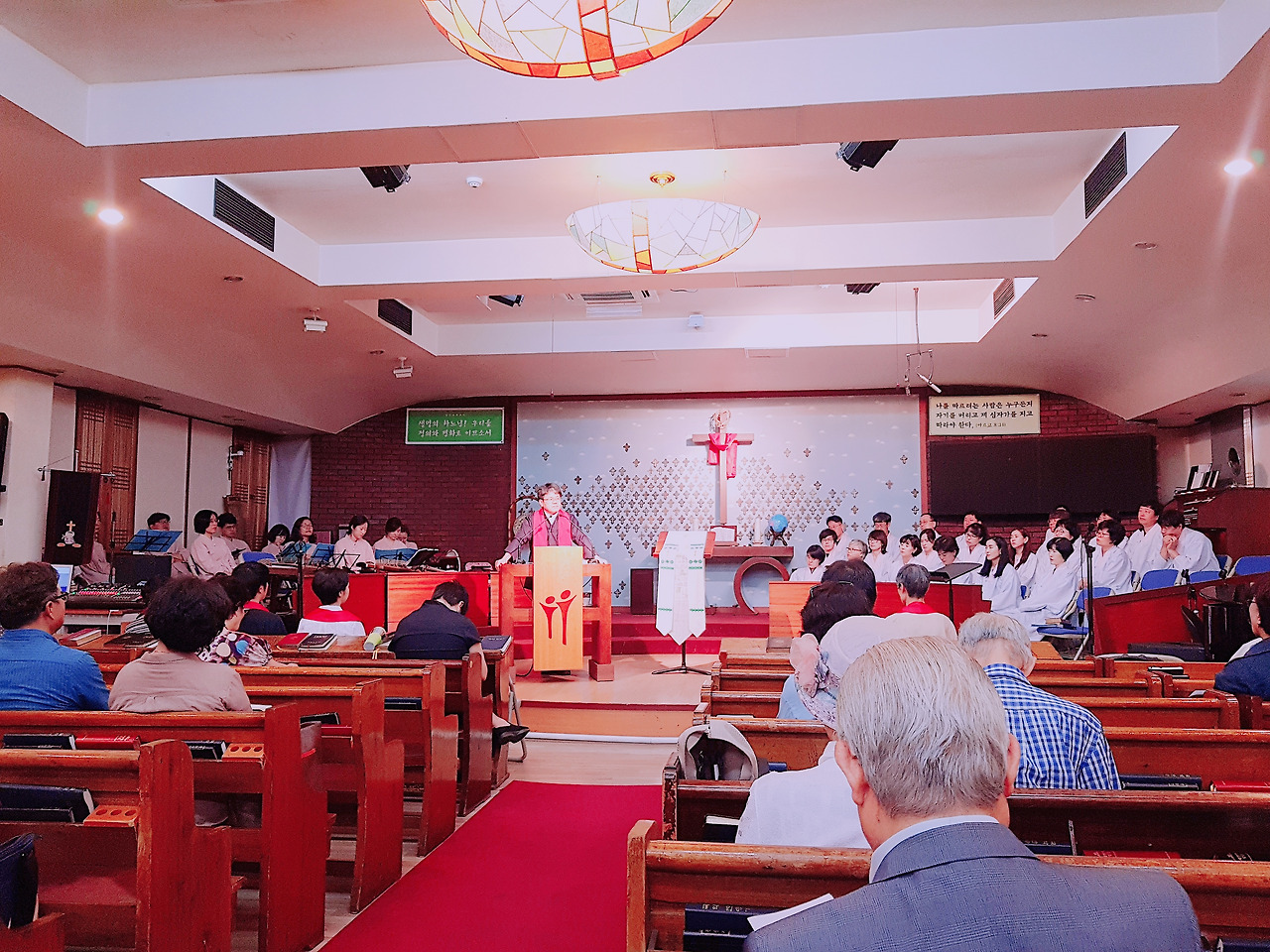 회(灰)와 인조석(人造石)으로 쌓아올린 교회당의 반향(反響)하는 천장 밑에서